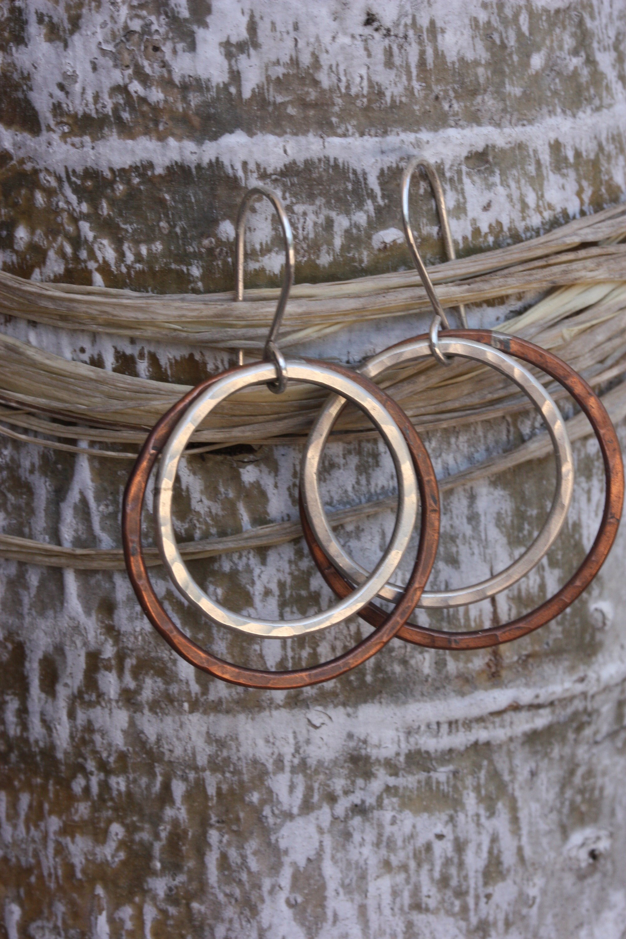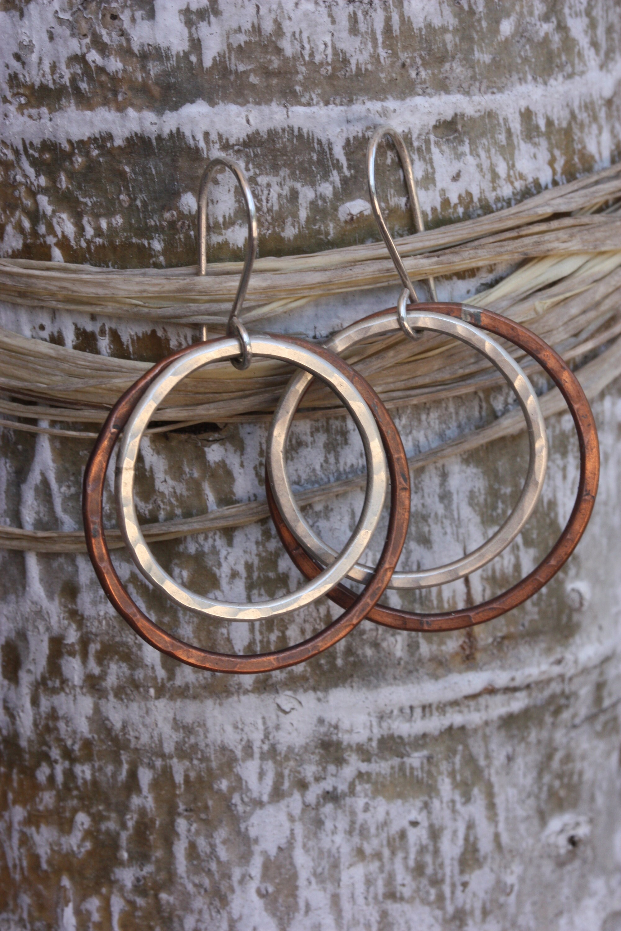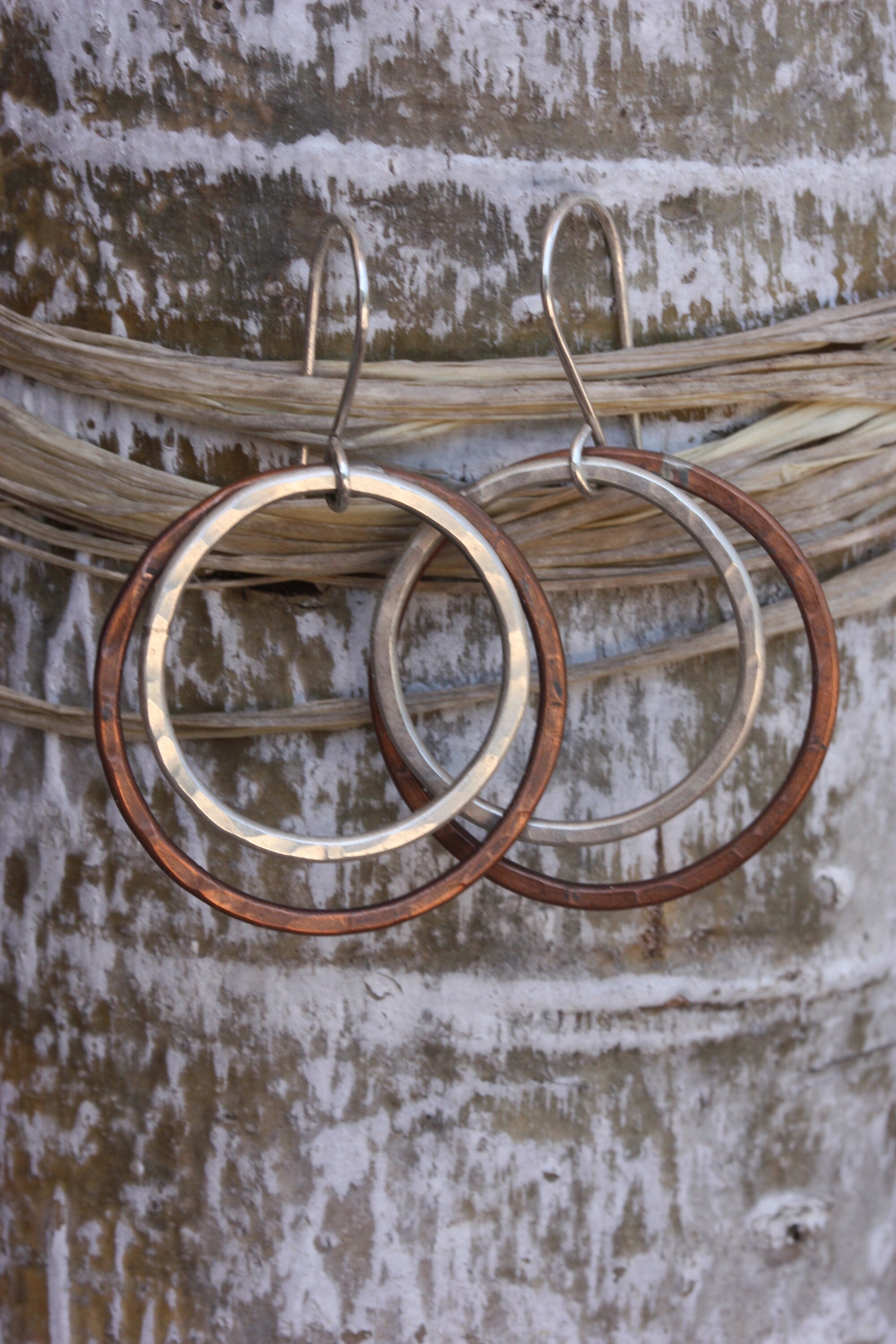 These light weight sterling silver and copper hoops are handmade by me from simple pieces of silver and copper wire. The copper hoops are about 1-1/8 inch (30 mm) wide. The sterling silver hoops are about 1 inch wide (26 mm) and fit inside the copper hoops. The hoops dangle from handmade sterling silver ear wires. They are 1 7/8 inches or 48 mm from the top off the ear wire to the bottom of the earrings. They are lightly hand textured for lots of sparkle.
