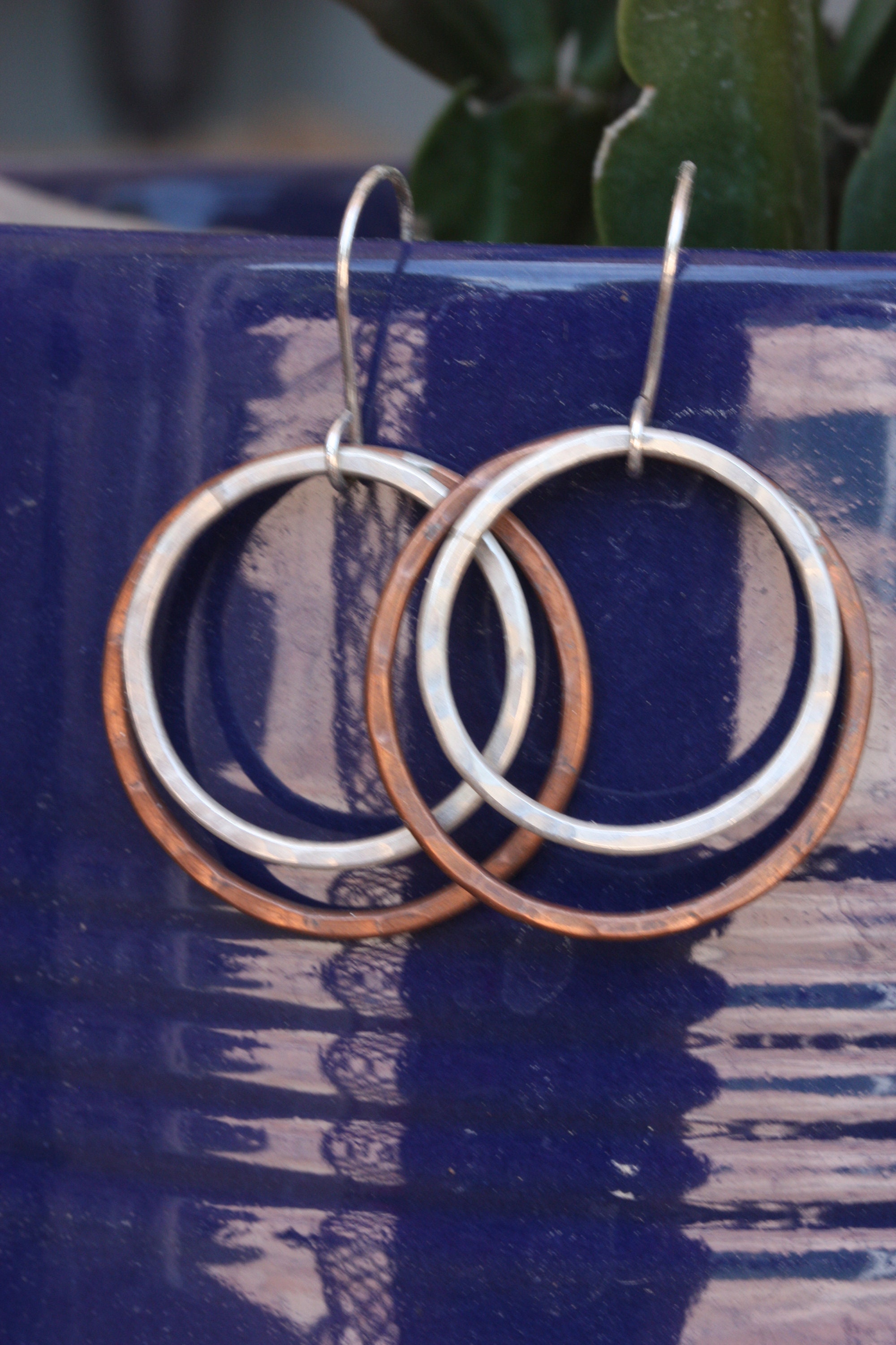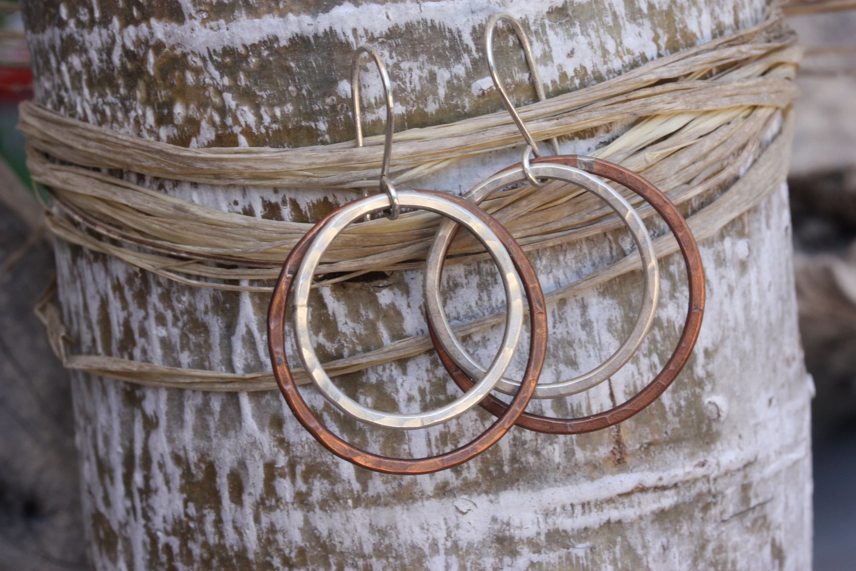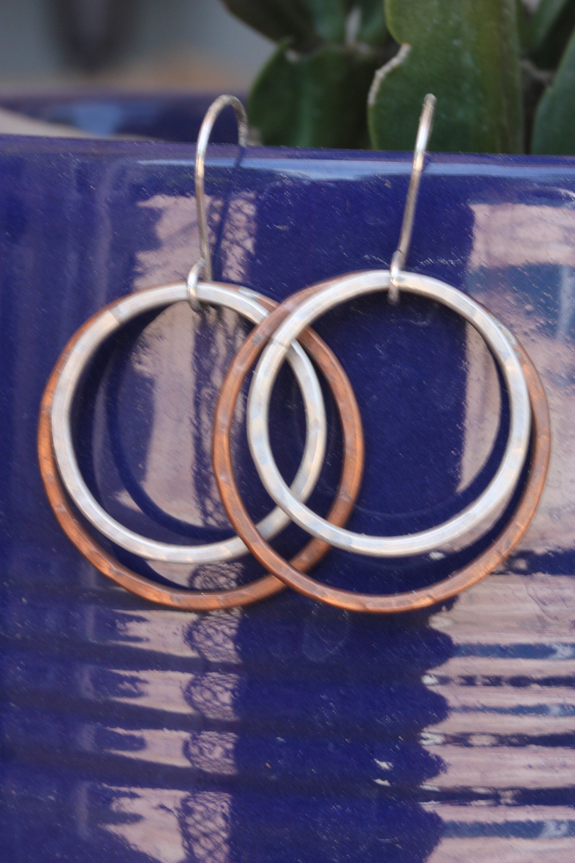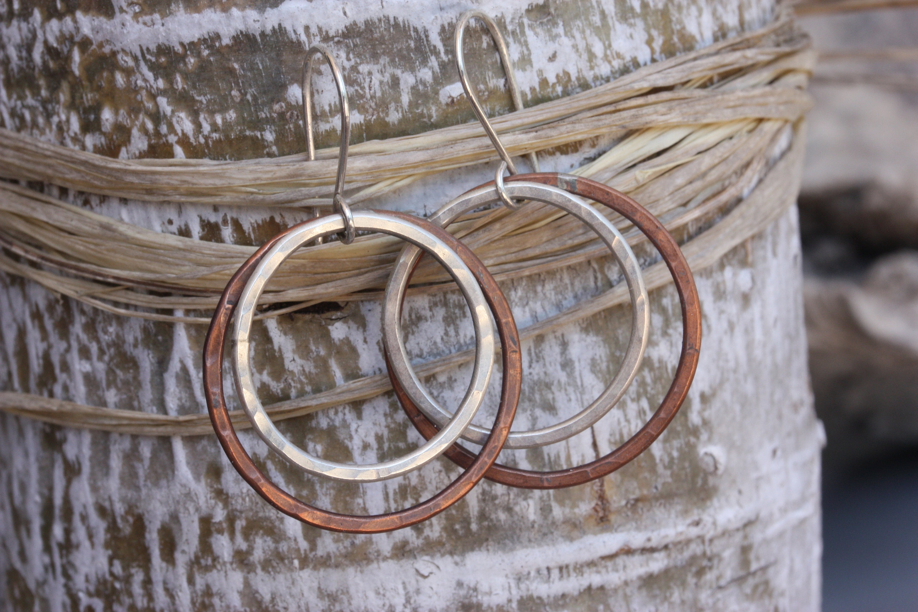 These light weight sterling silver and copper hoops are handmade by me from simple pieces of silver and copper wire. The copper hoops are about 1-1/8 inch (30 mm) wide. The sterling silver hoops are about 1 inch wide (26 mm) and fit inside the copper hoops. The hoops dangle from handmade sterling silver ear wires. They are 1 7/8 inches or 48 mm from the top off the ear wire to the bottom of the earrings. They are lightly hand textured for lots of sparkle.