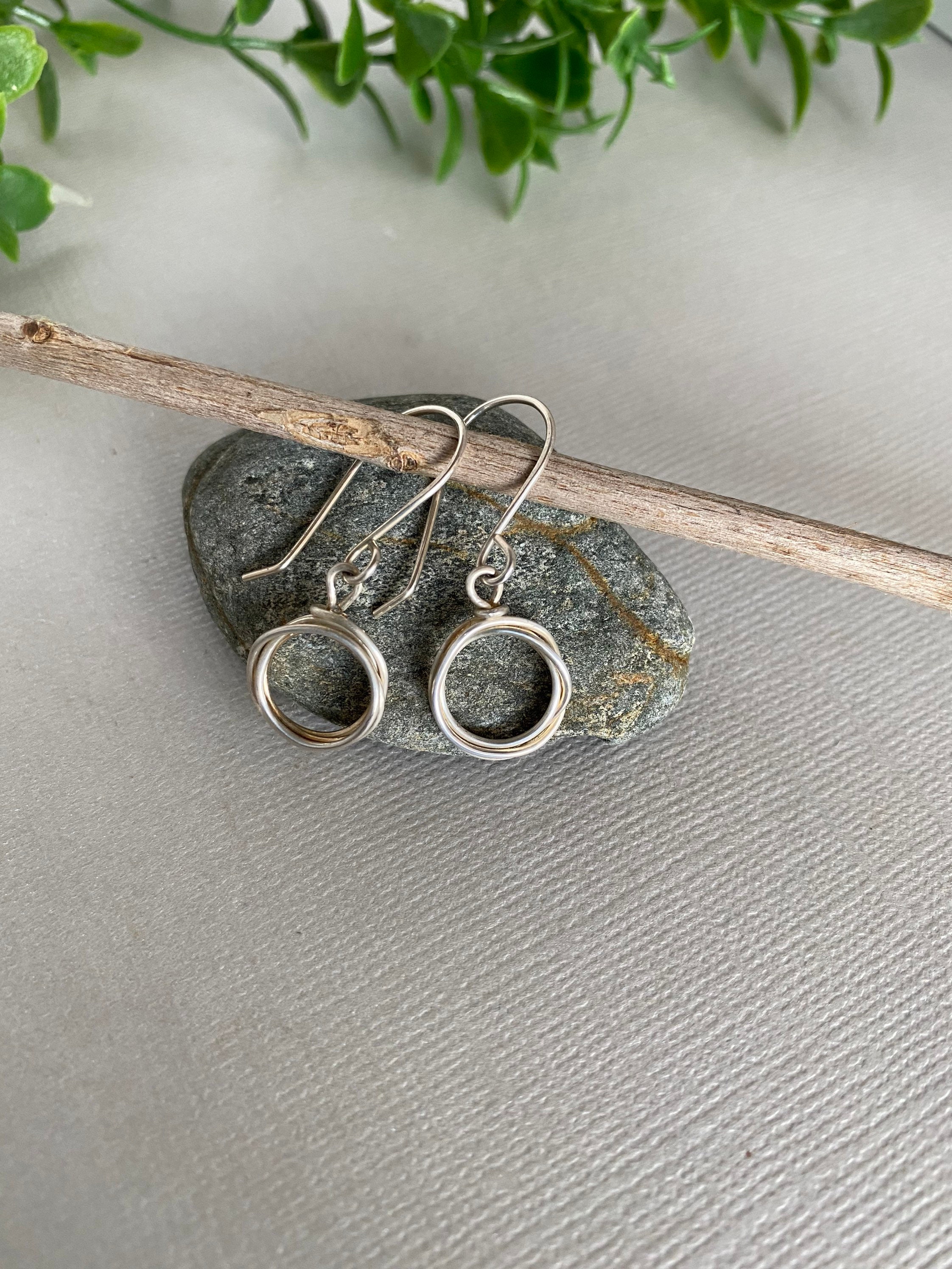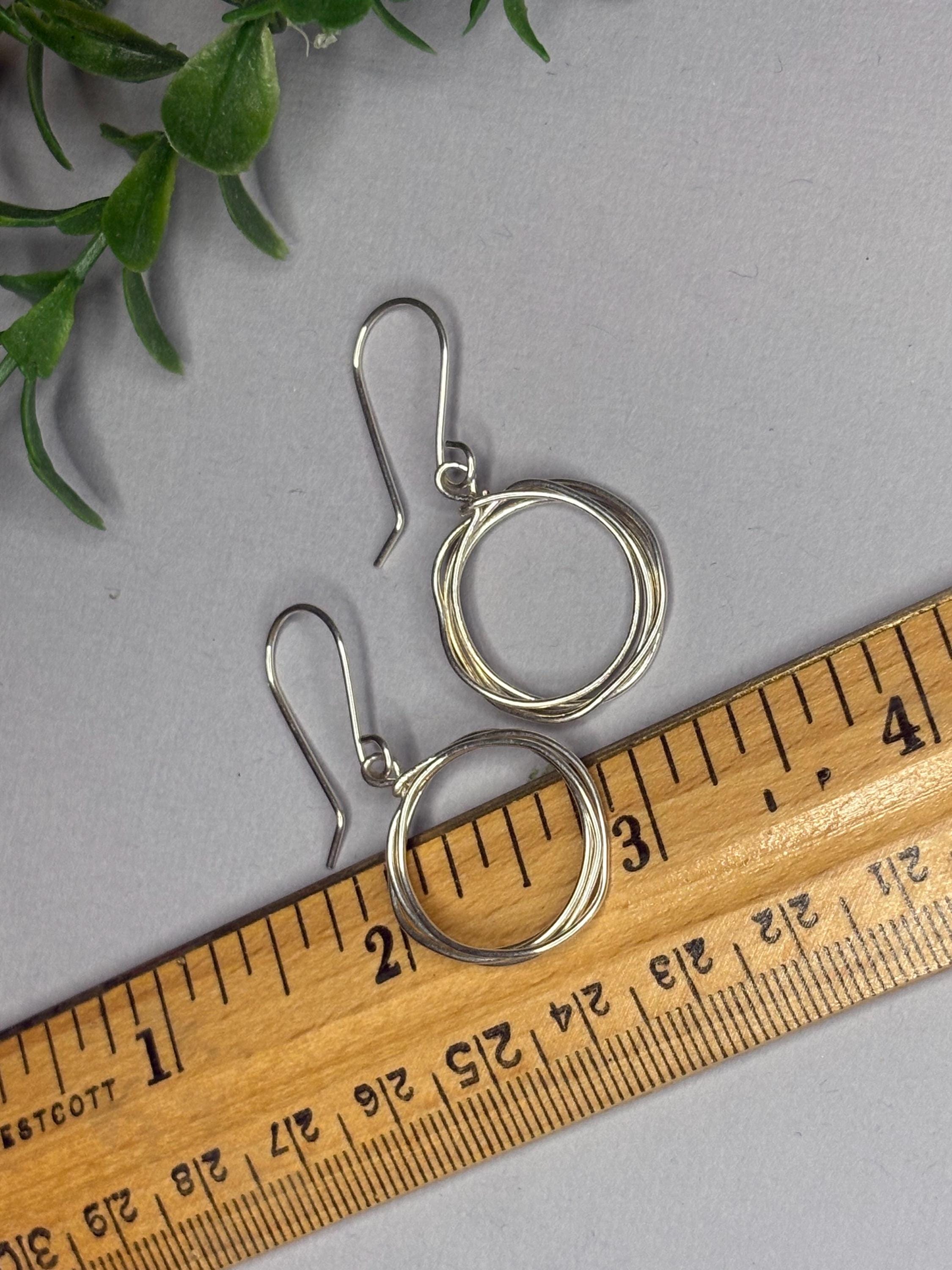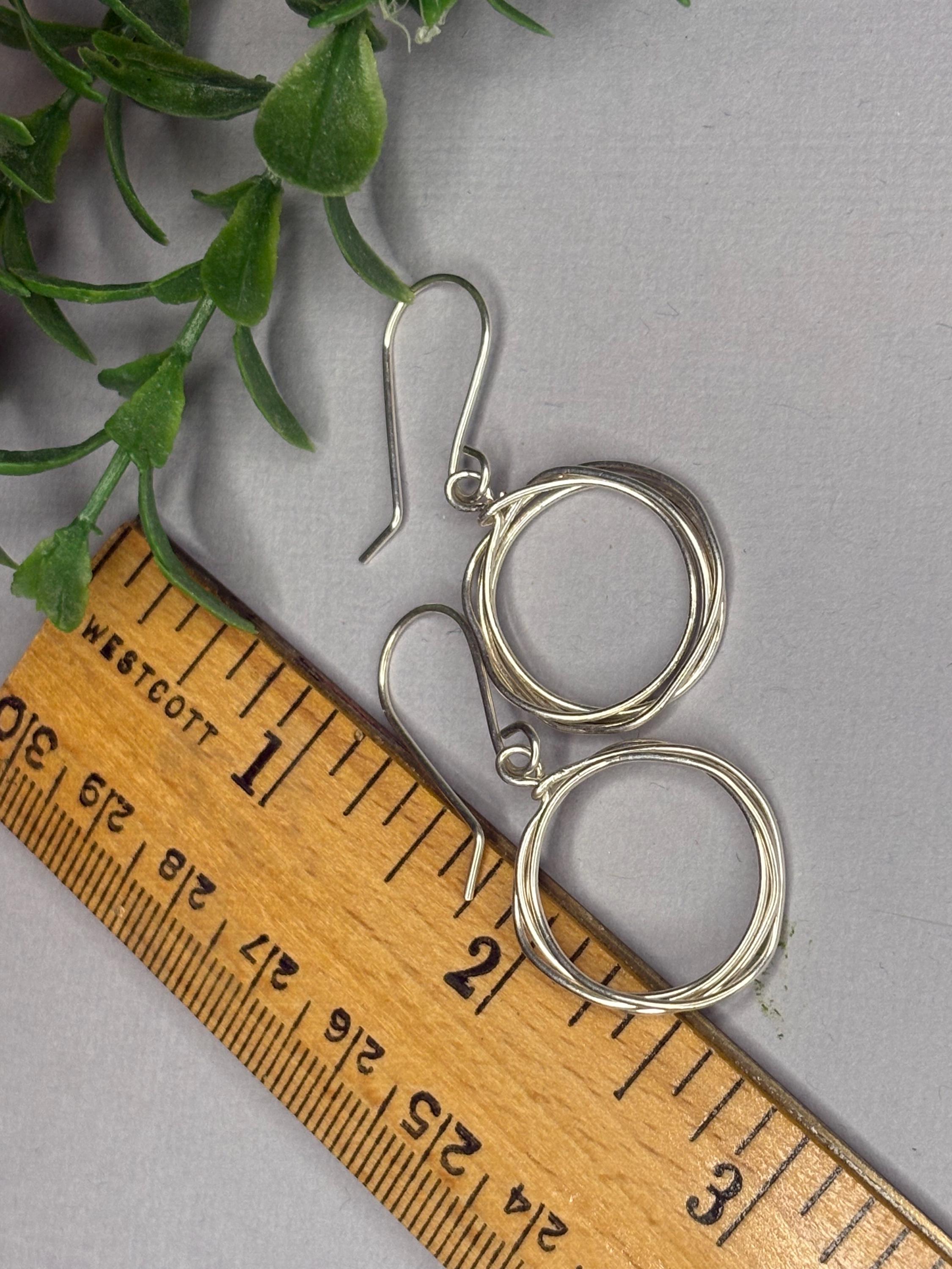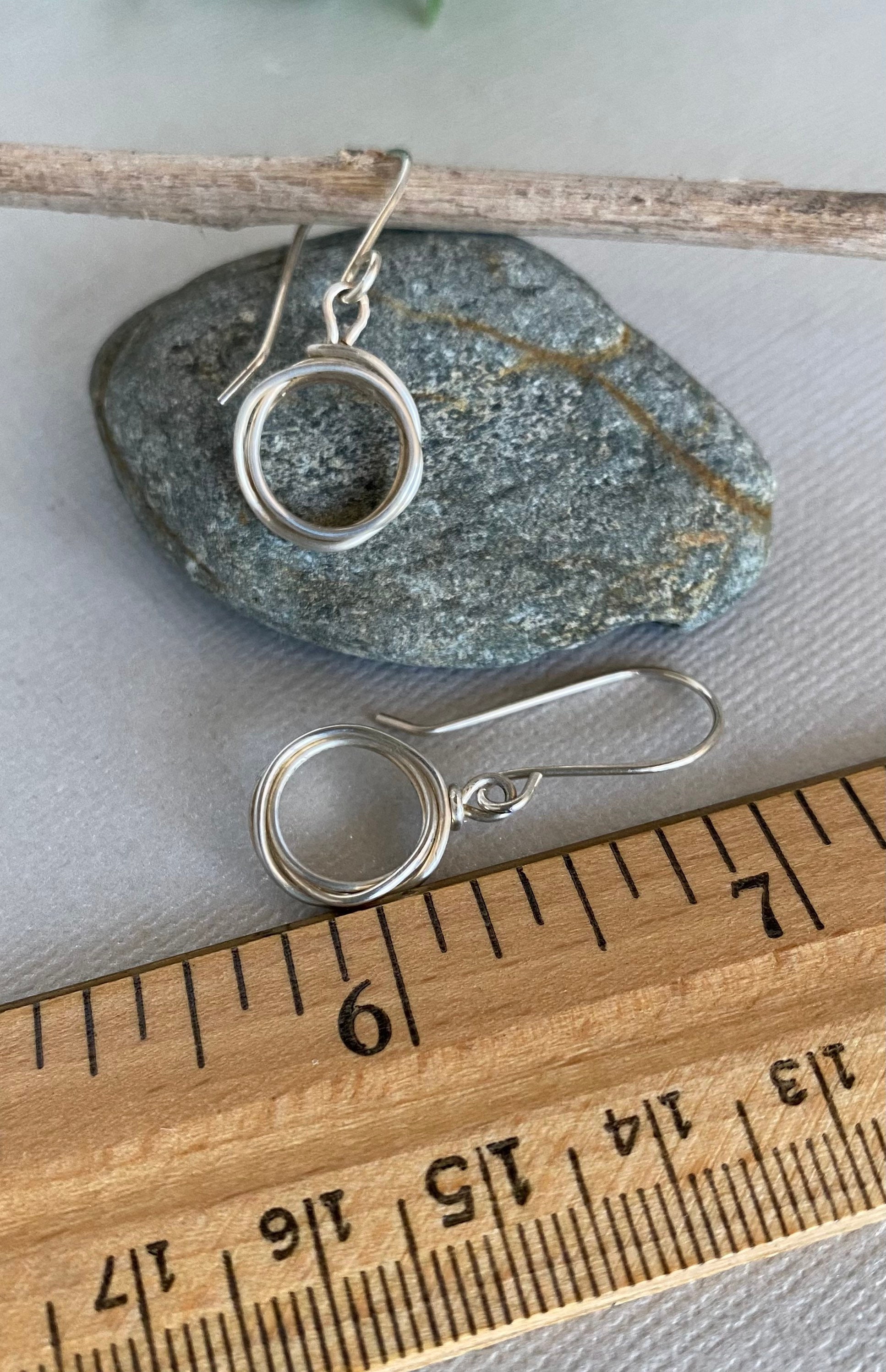 These sterling silver hoops are handmade from a piece of wire that I wrap into a simple circle a few times. They are about 1 and 3/8 inch long from the top of the ear wire to the bottom of the hoop. The hoops are about 1/2 inch. So simple and elegant. They dangle from handmade sterling silver ear wires. These hoops will be your go to silver earrings for everyday. They would make a wonderful gift too!