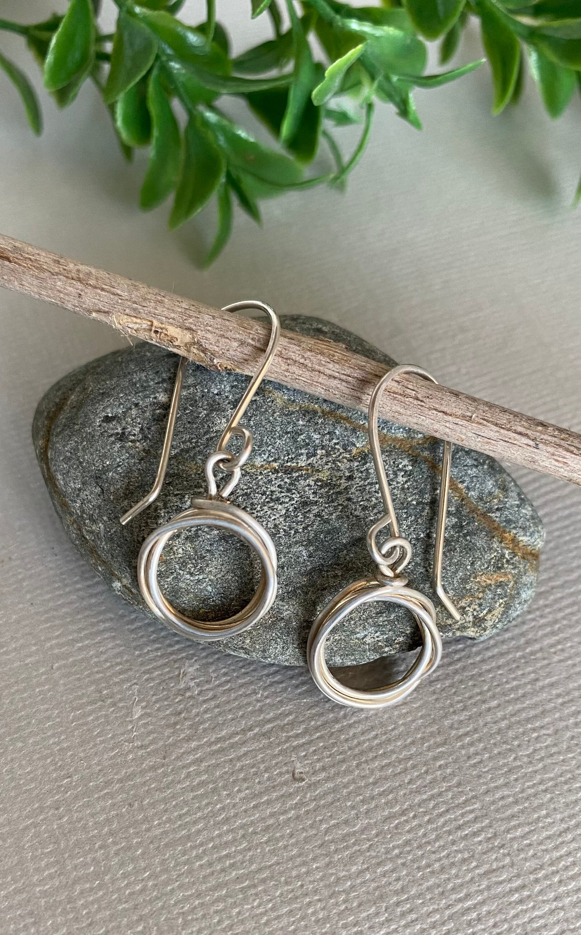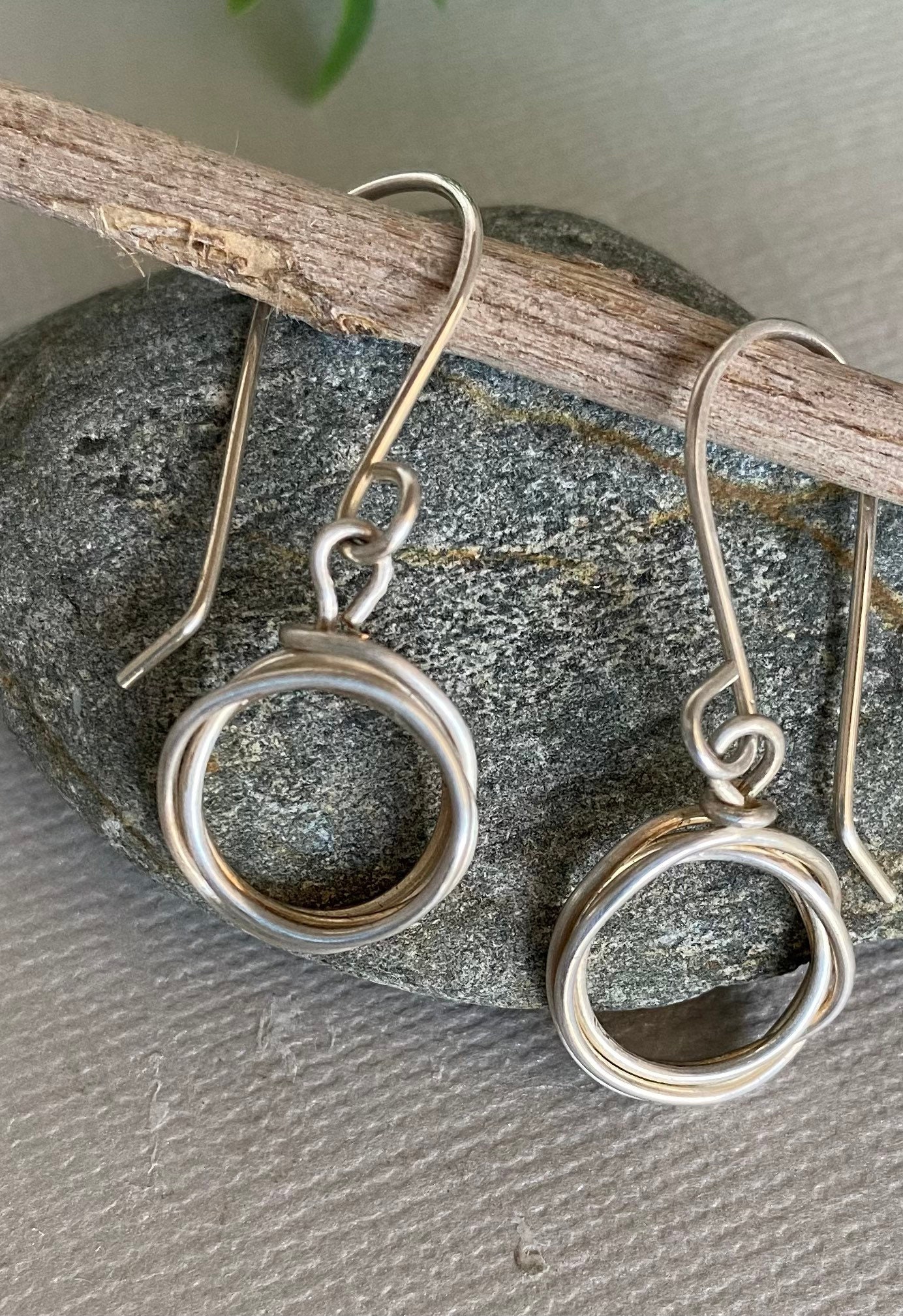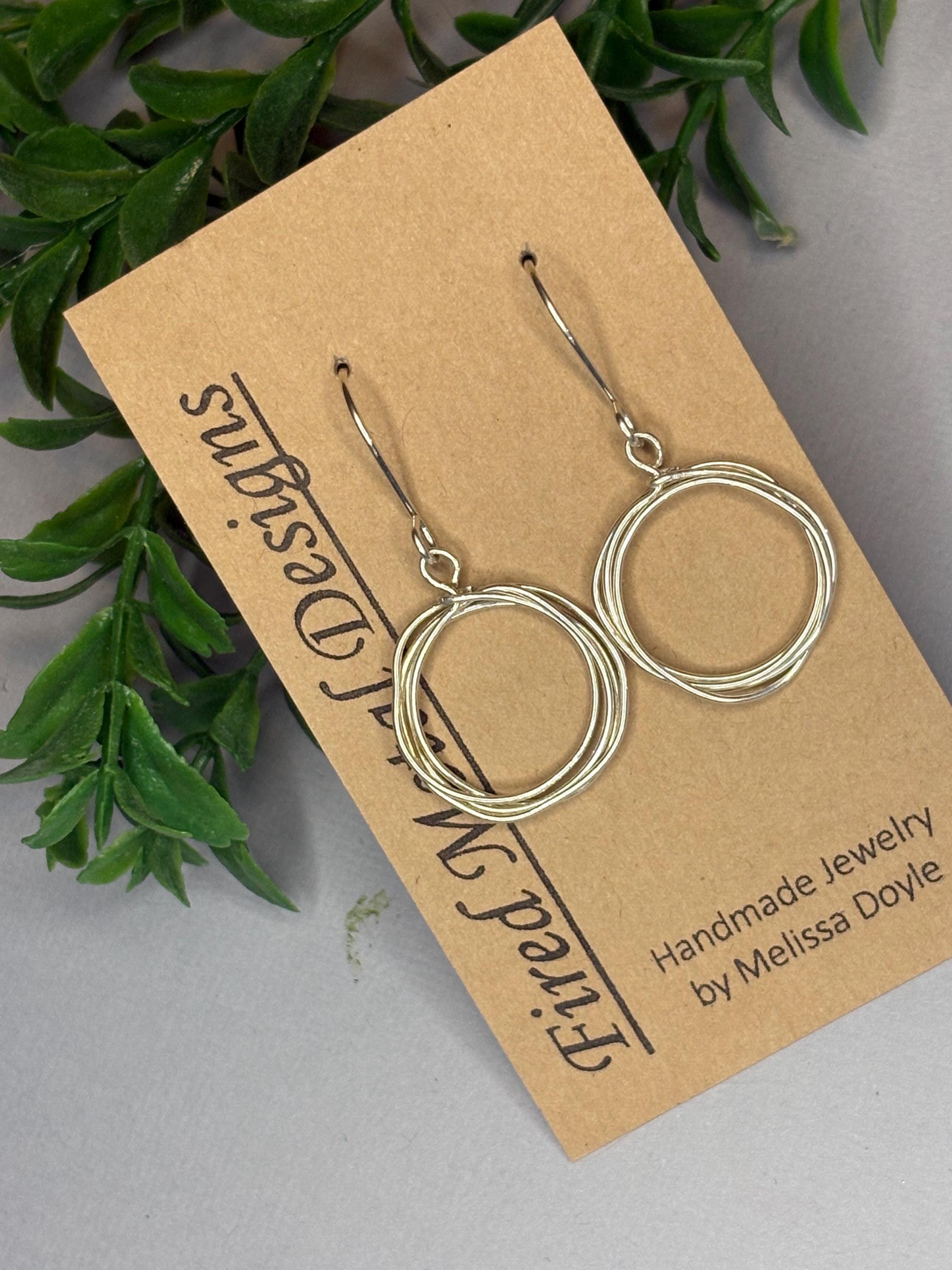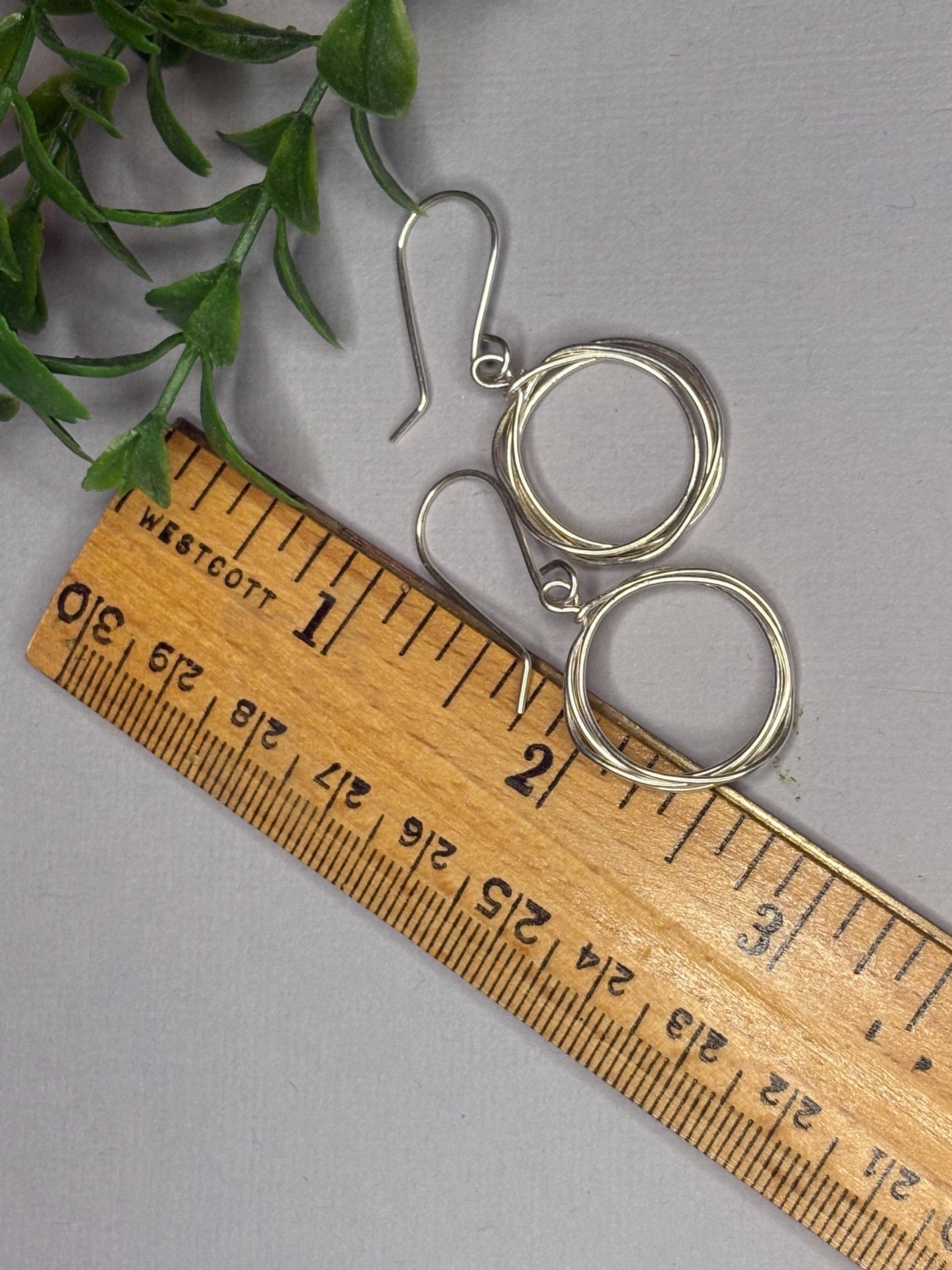 These sterling silver hoops are handmade from a piece of wire that I wrap into a simple circle a few times. They are about 1 and 3/8 inch long from the top of the ear wire to the bottom of the hoop. The hoops are about 1/2 inch. So simple and elegant. They dangle from handmade sterling silver ear wires. These hoops will be your go to silver earrings for everyday. They would make a wonderful gift too!