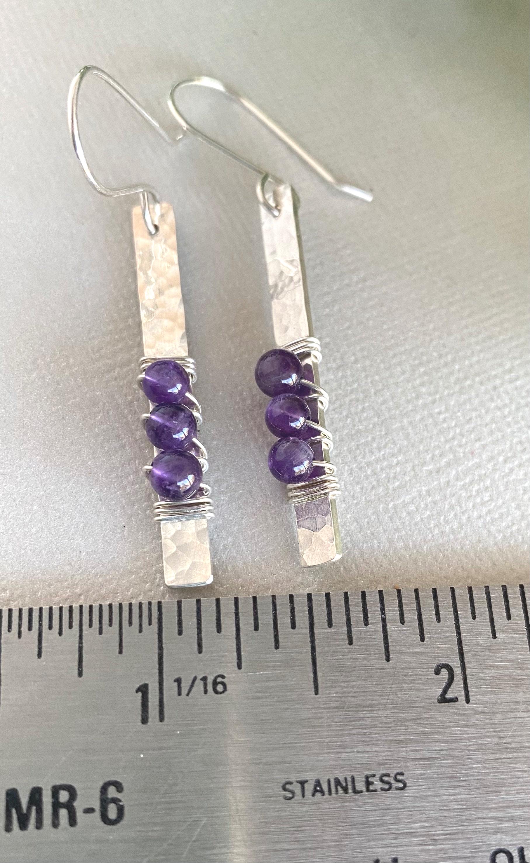 The sterling silver is hand cut from a piece of 4 mm flat wire then textured to reflect lots of light. The 4 mm amethyst beads are wrapped around the flat wire with very fine gauge sterling silver wire. The real amethysts are a beautiful purple and are perfect for a February birthday gift!