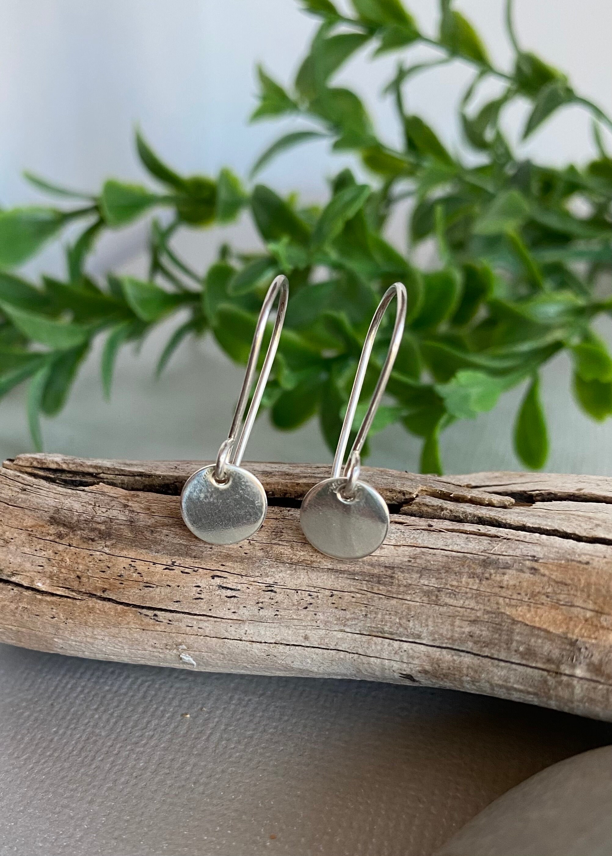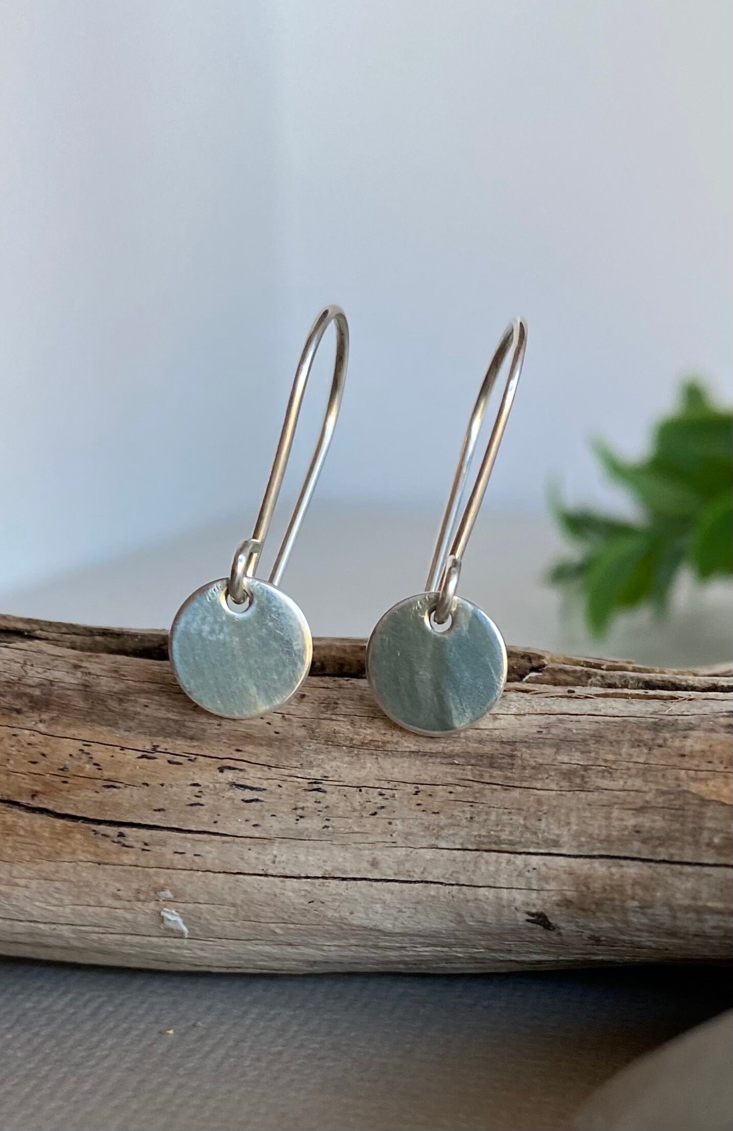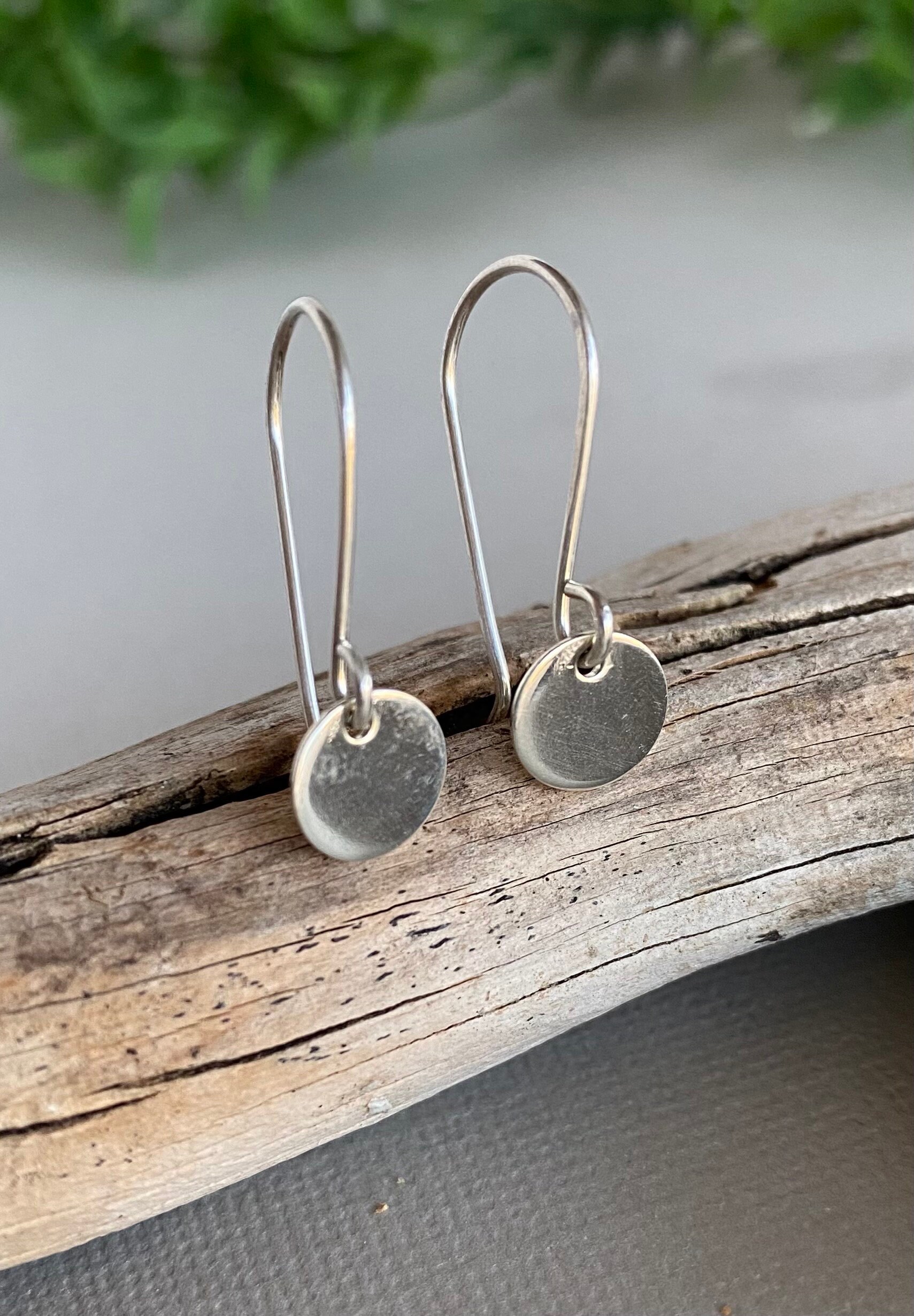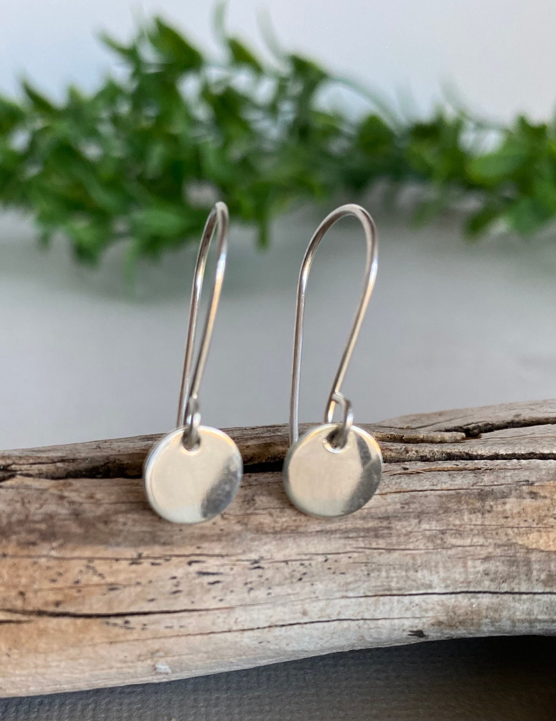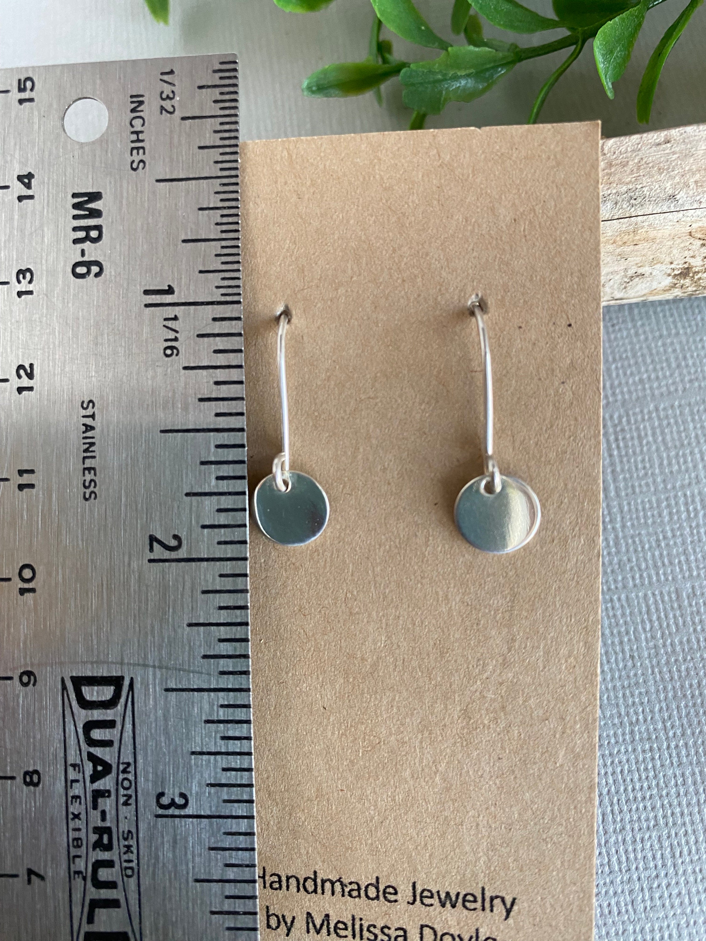 These tiny round disk earrings are perfect for the person who likes small and light weight earrings! Hand cut sterling silver round disks are cut and polished with a matte finish. They dangle from a sterling silver handmade ear wires. The disks are about 3/8” round and the total length of these earrings are only about an 1'. See my photos for the length and width of these really cute earrings!
