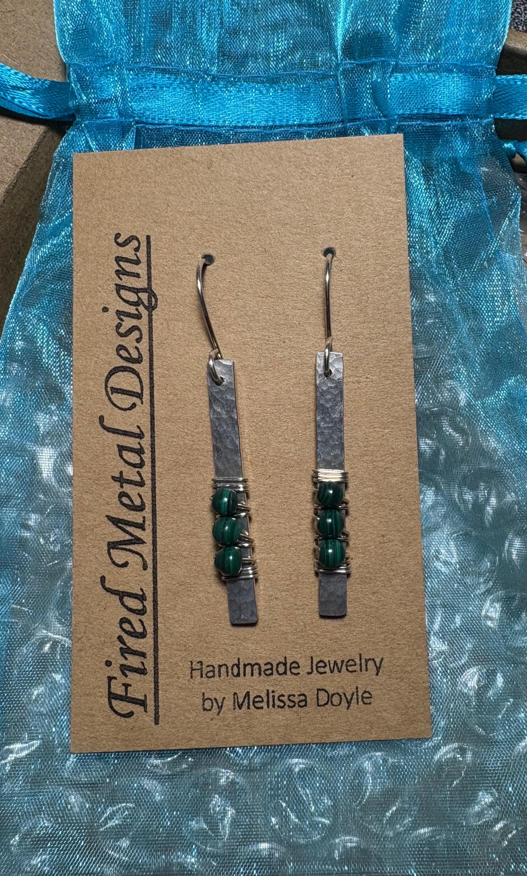 These hand textured sterling silver and green malachite earrings are very light weight and fun to wear with anything! The beautiful green of the beads reflect the different colors of malachite.