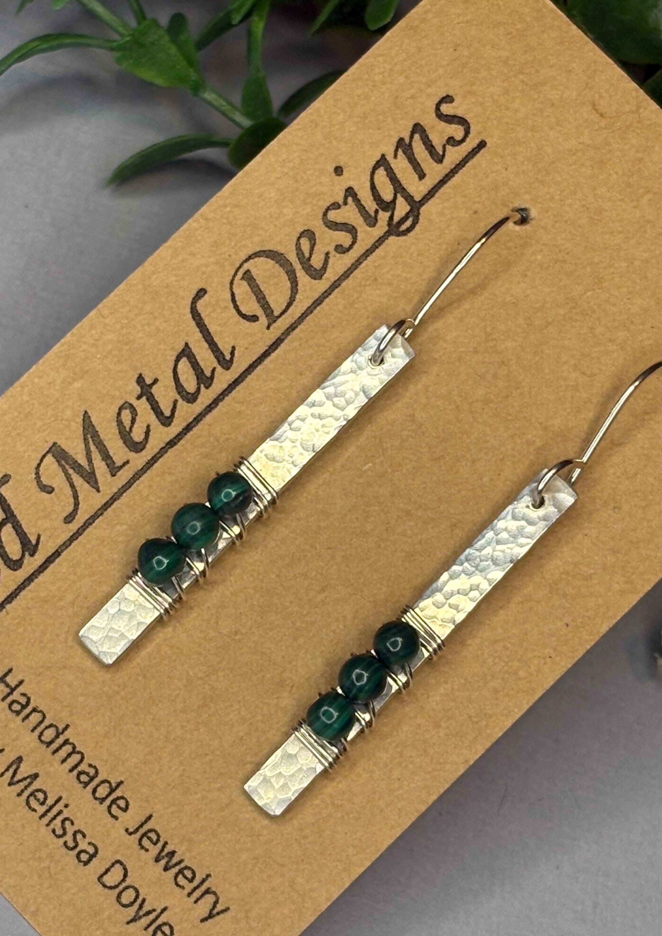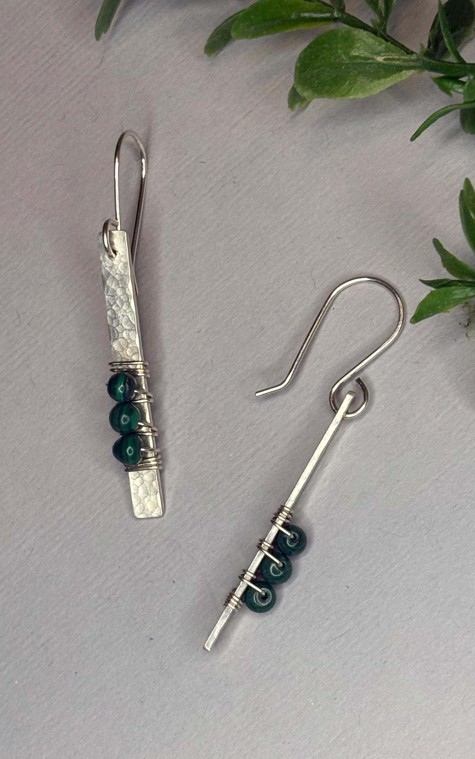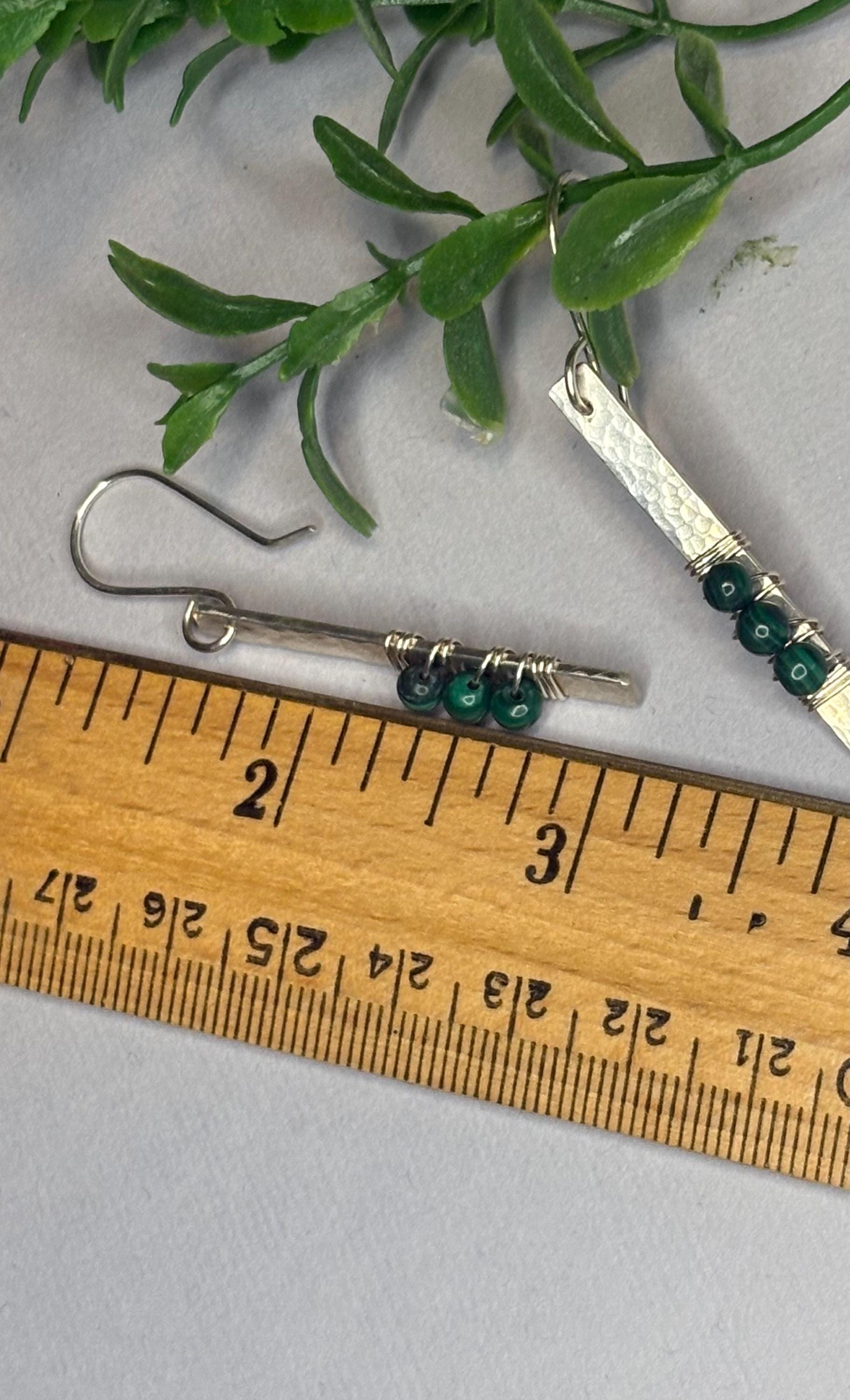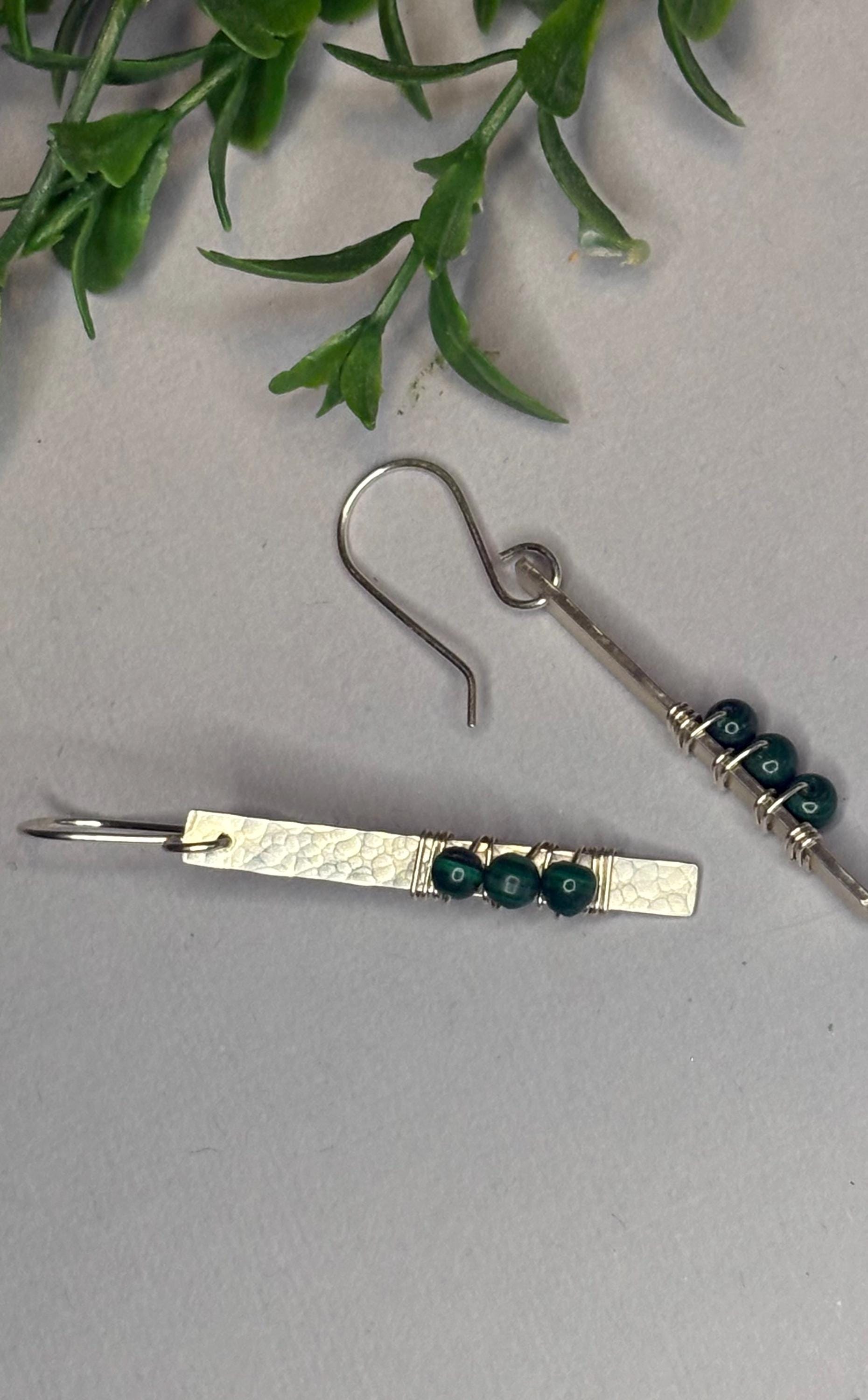 The sterling silver dangles are hand cut from a piece of 4 X 1mm sterling wire and hammered to reflect lots of light. The 4mm beads are wrapped around the flat wire with very fine gauge sterling silver wire. The total length of the earrings from top to bottom is about 2". The silver dangles are 1.5" long. See my photos for measurements. They dangle gracefully from handmade sterling silver ear wire.