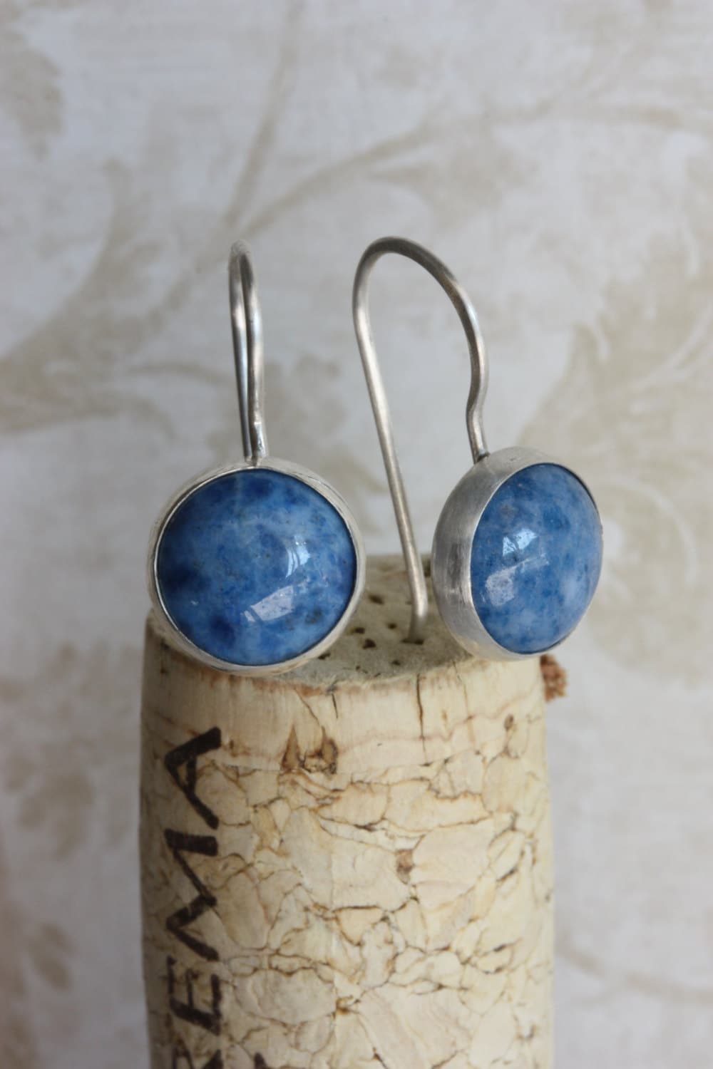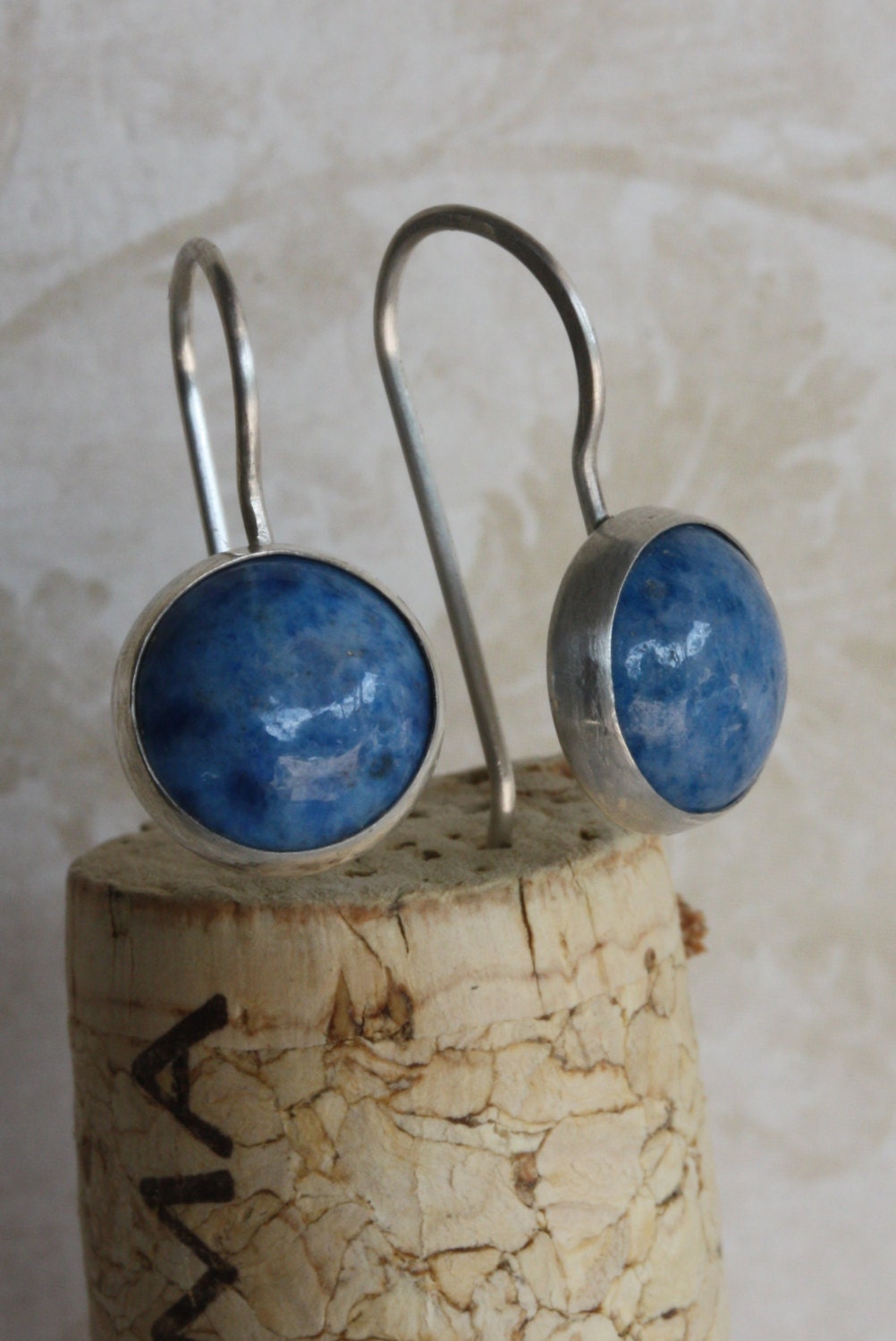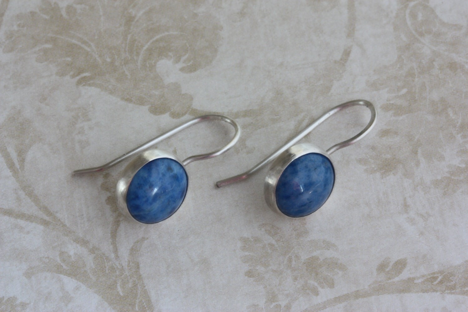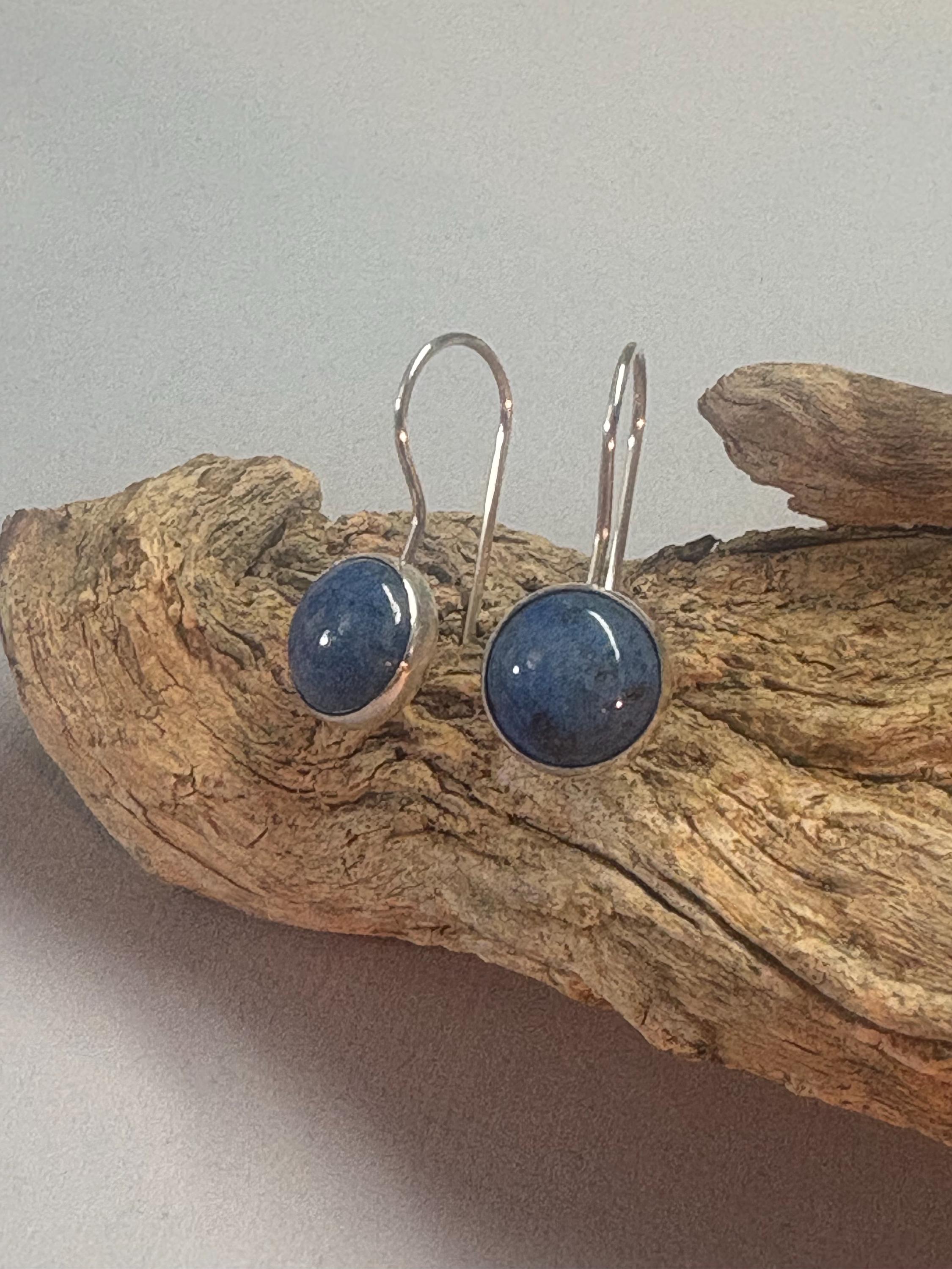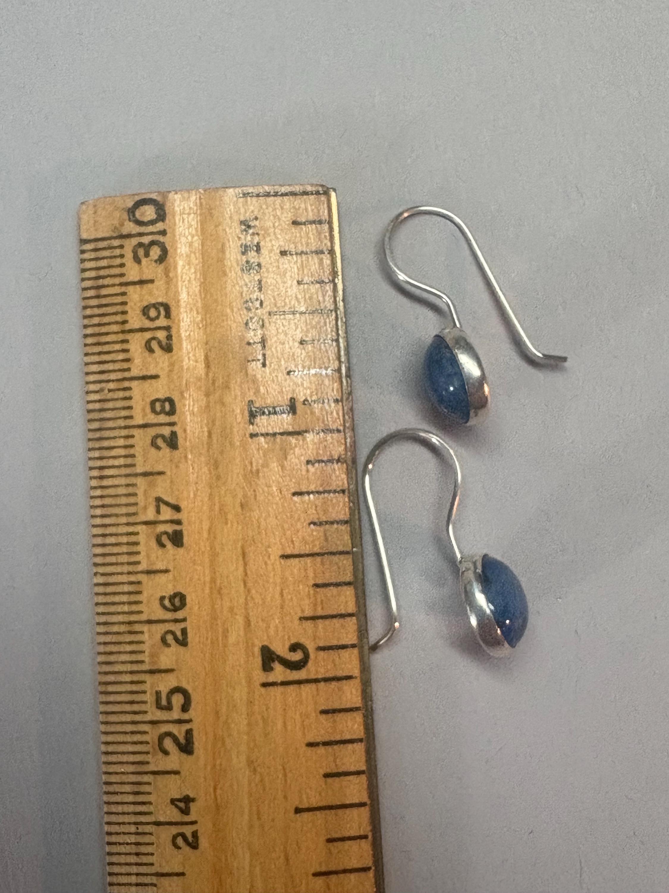 The lapis stones are set in sterling silver bezel cups and soldered sterling silver ear wires. They hang approximately 1 inch from top to bottom of the earring. The lapis is a 10 mm stone, about 3/8 of an inch.