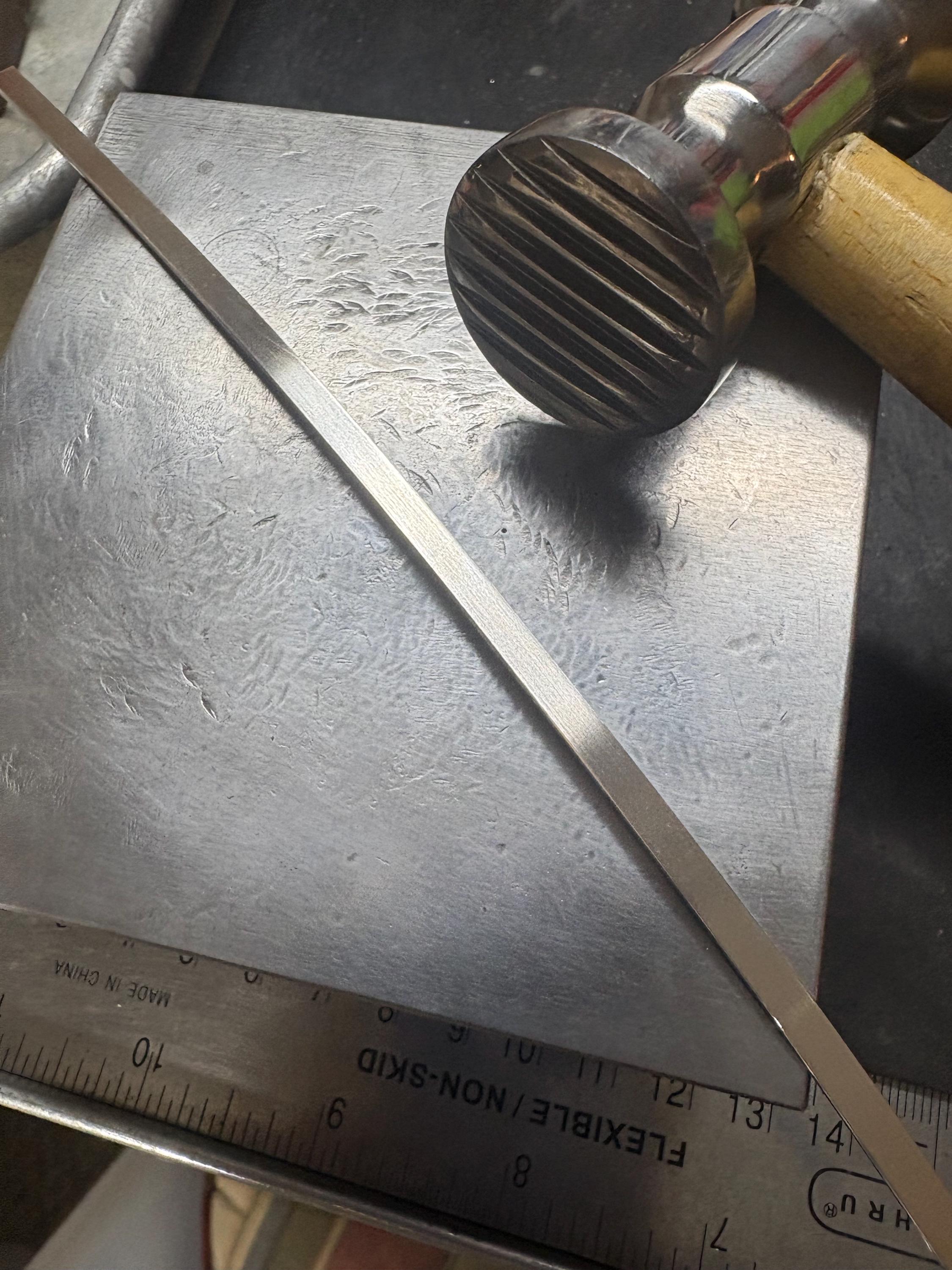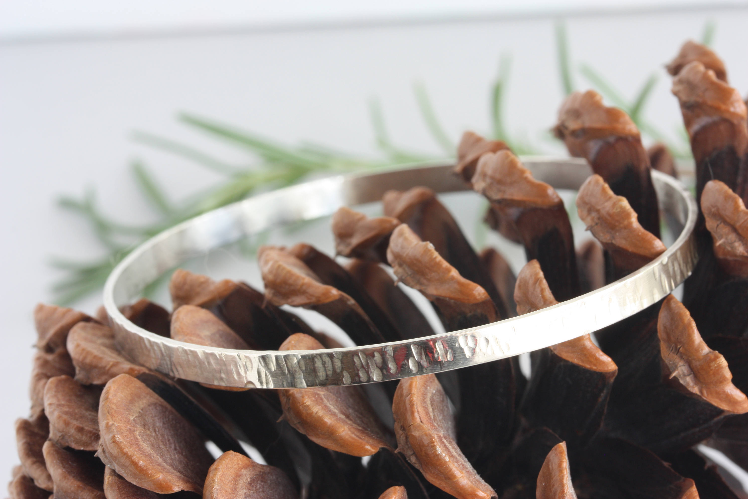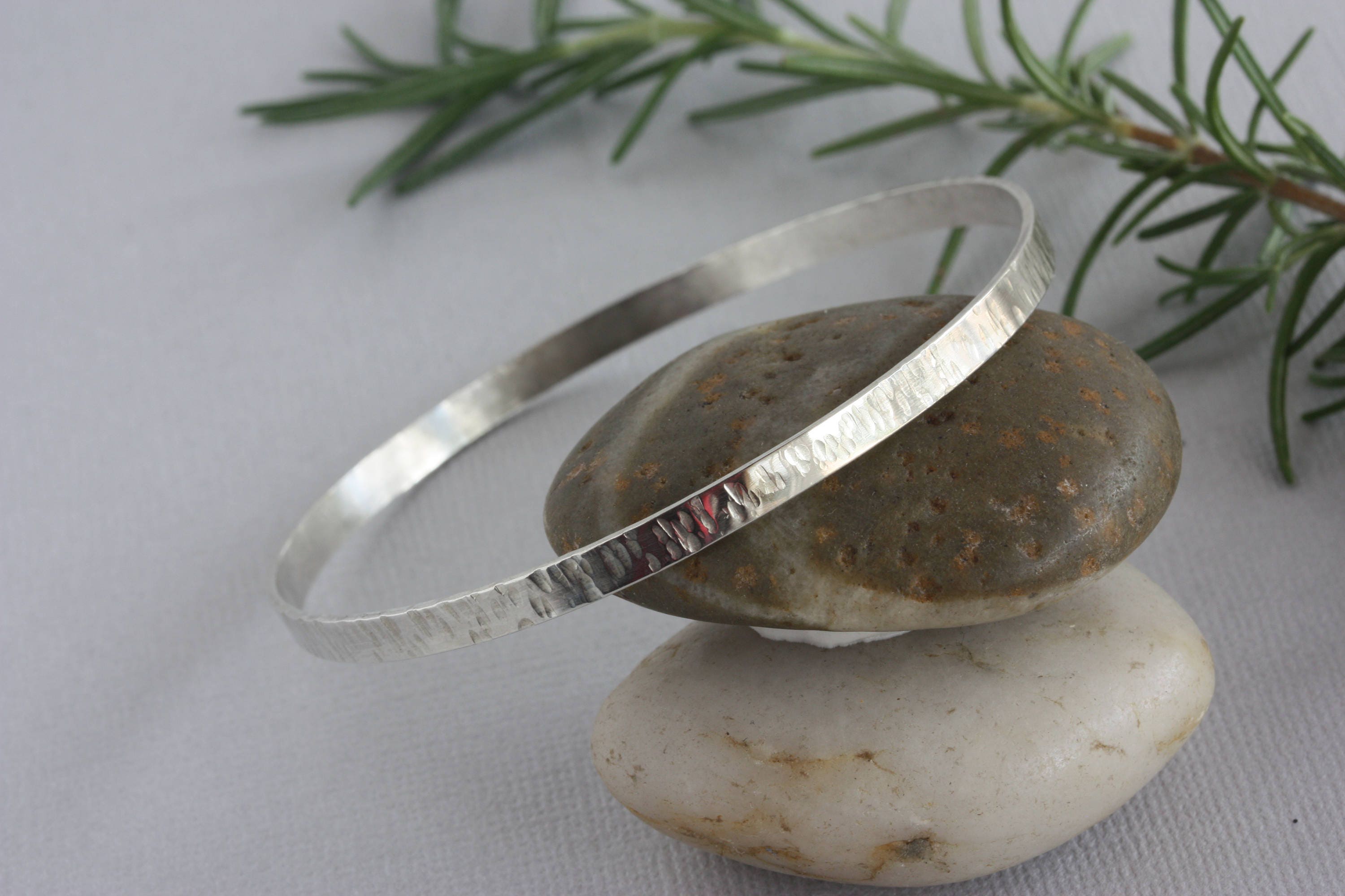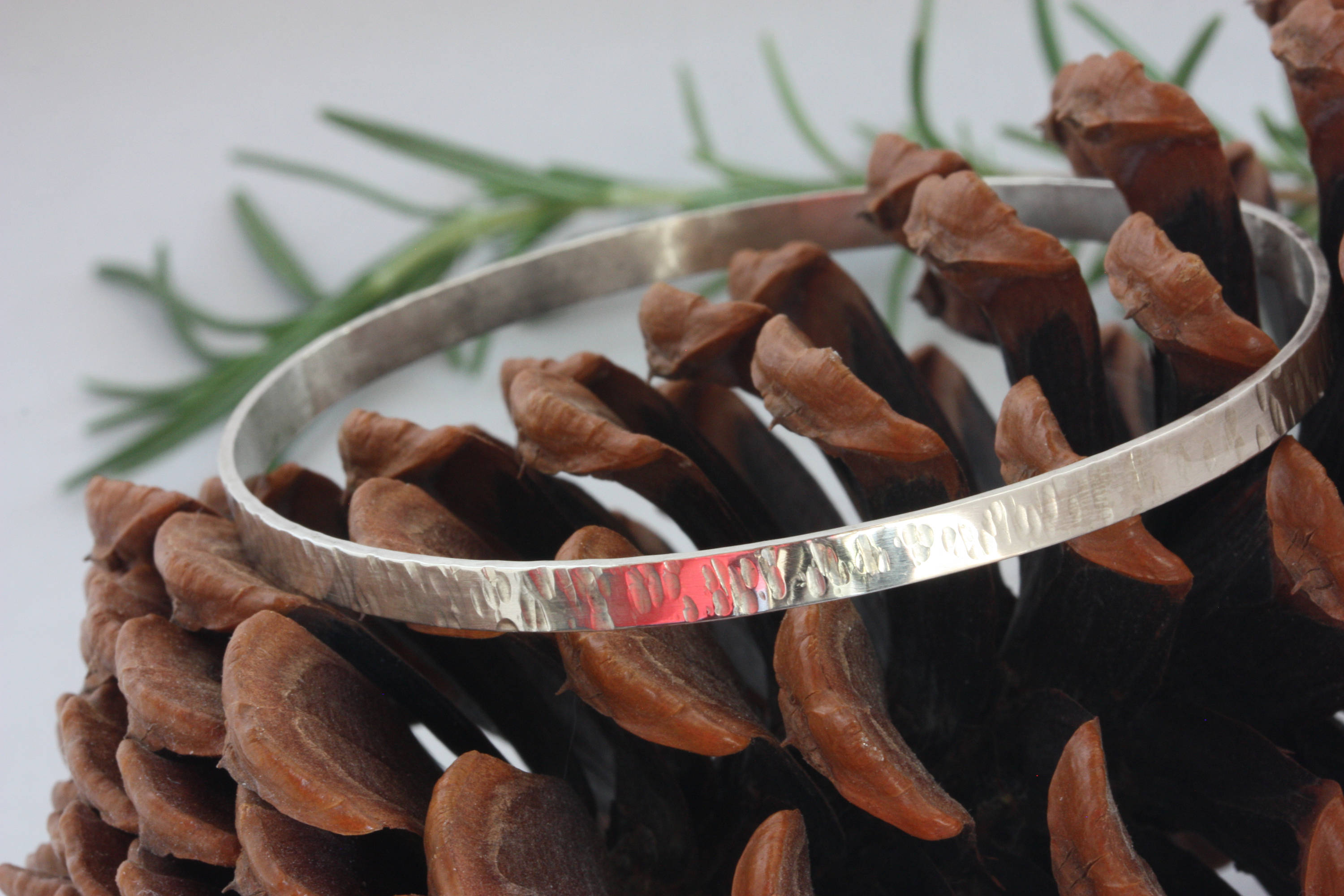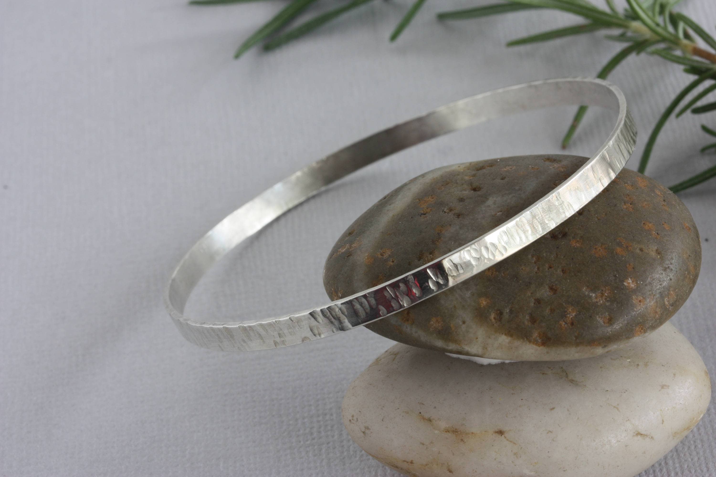The width is 4 mm x 1 mm. It's a nice weight, not to light and not to heavy. It is made from flat wire and soldered into a circle. It is hand hammered by me. Please choose your size carefully. If you're not sure what size to order, please contact me and I can help you with your order. You can measure the inside diameter of a bangle bracelet that fits you to get an idea of what size you'll need. Most women are a medium size of 2.5".