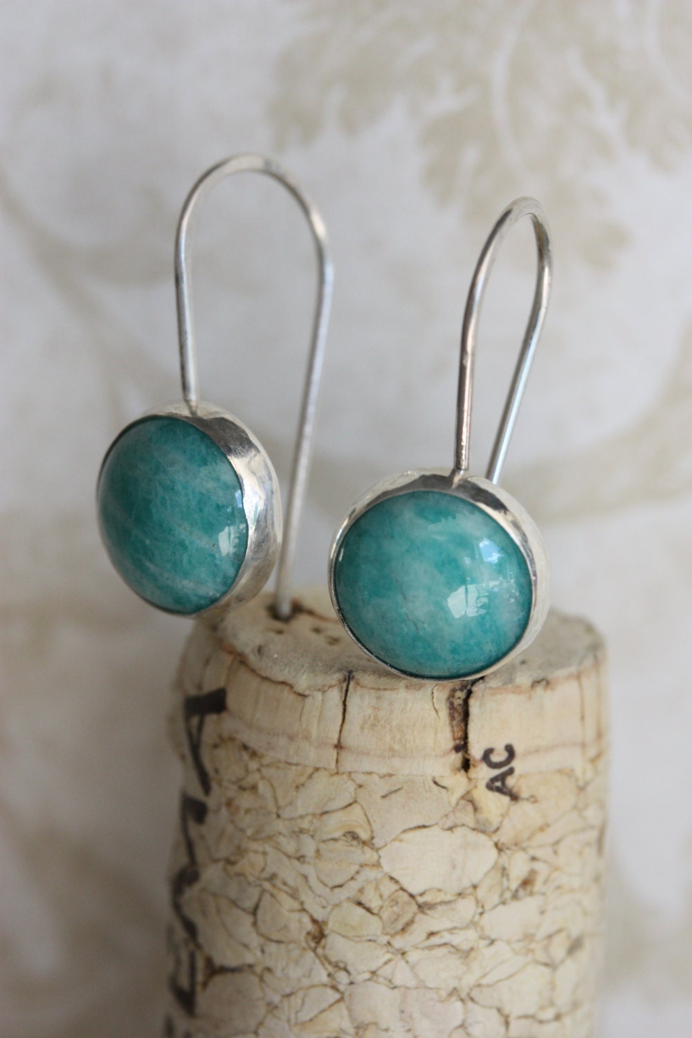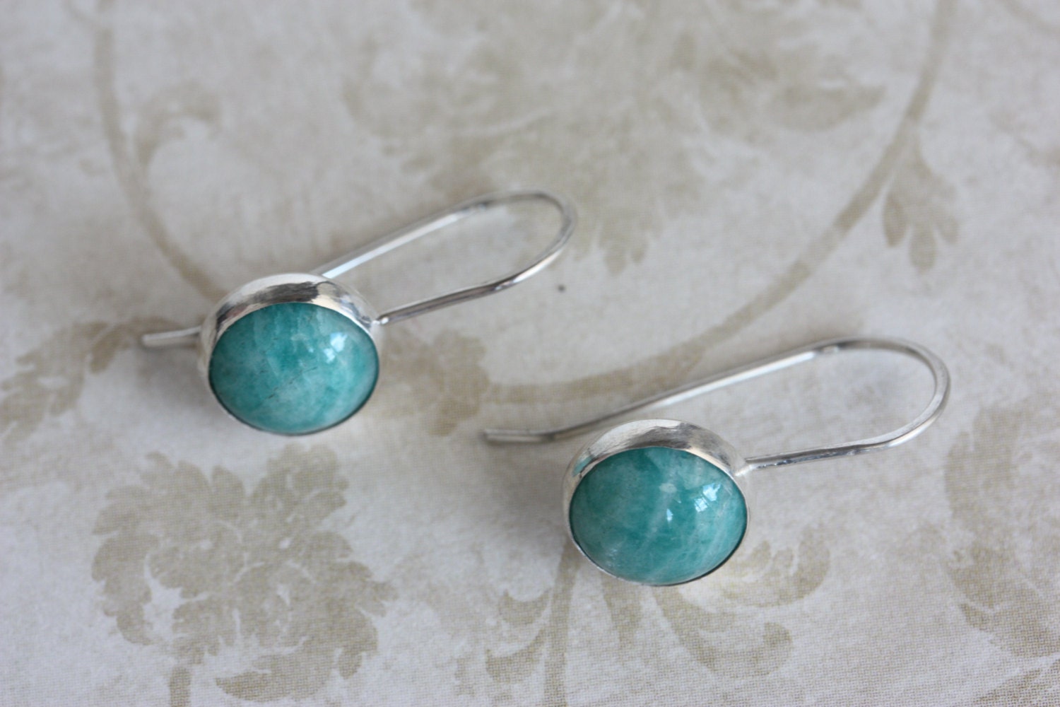 The 10 mm Amazonite cabochons are set in sterling silver bezel cups and have sterling silver ear wires soldered at the top. They are about 1 inch long and 1/2 wide.