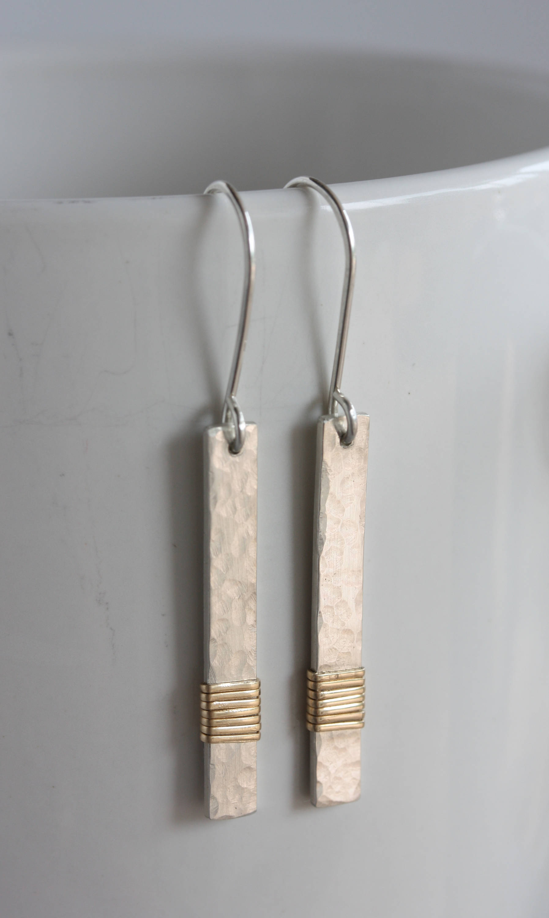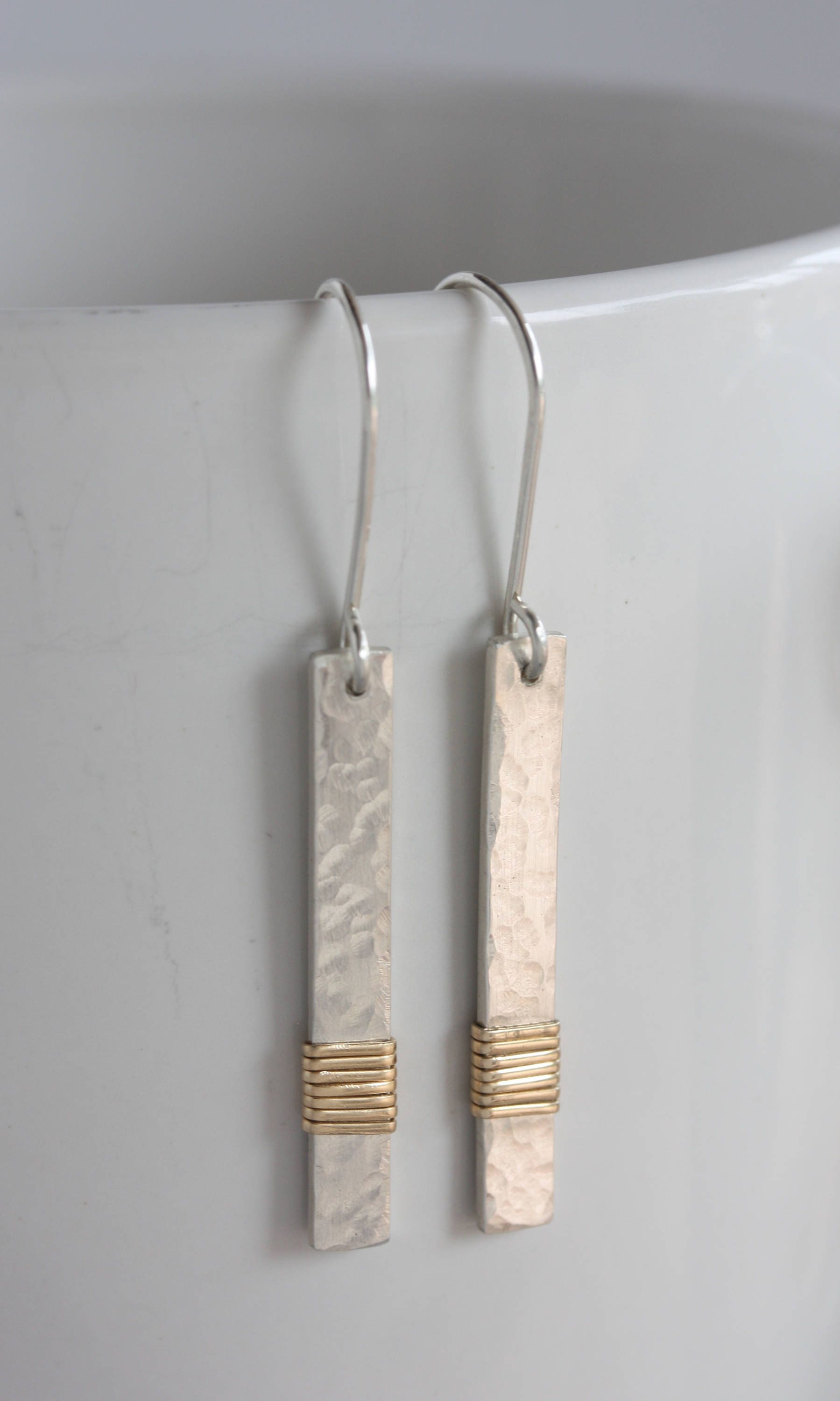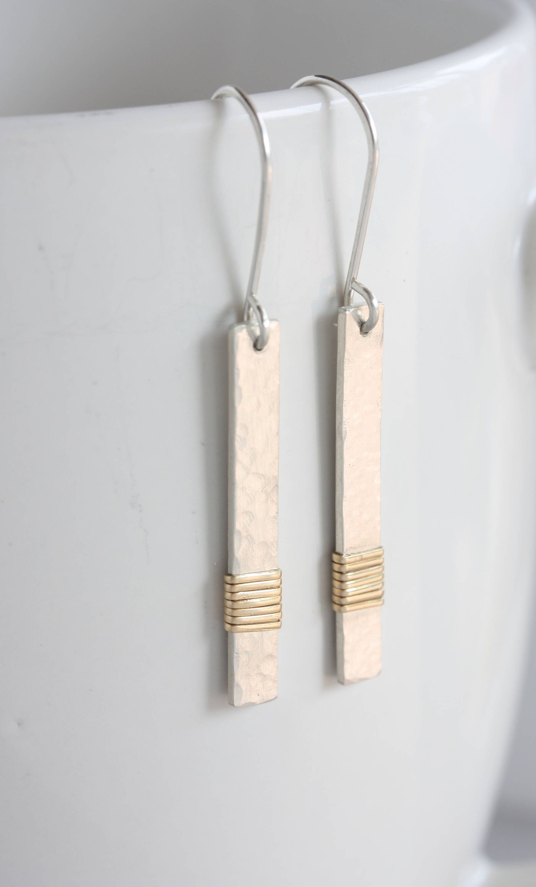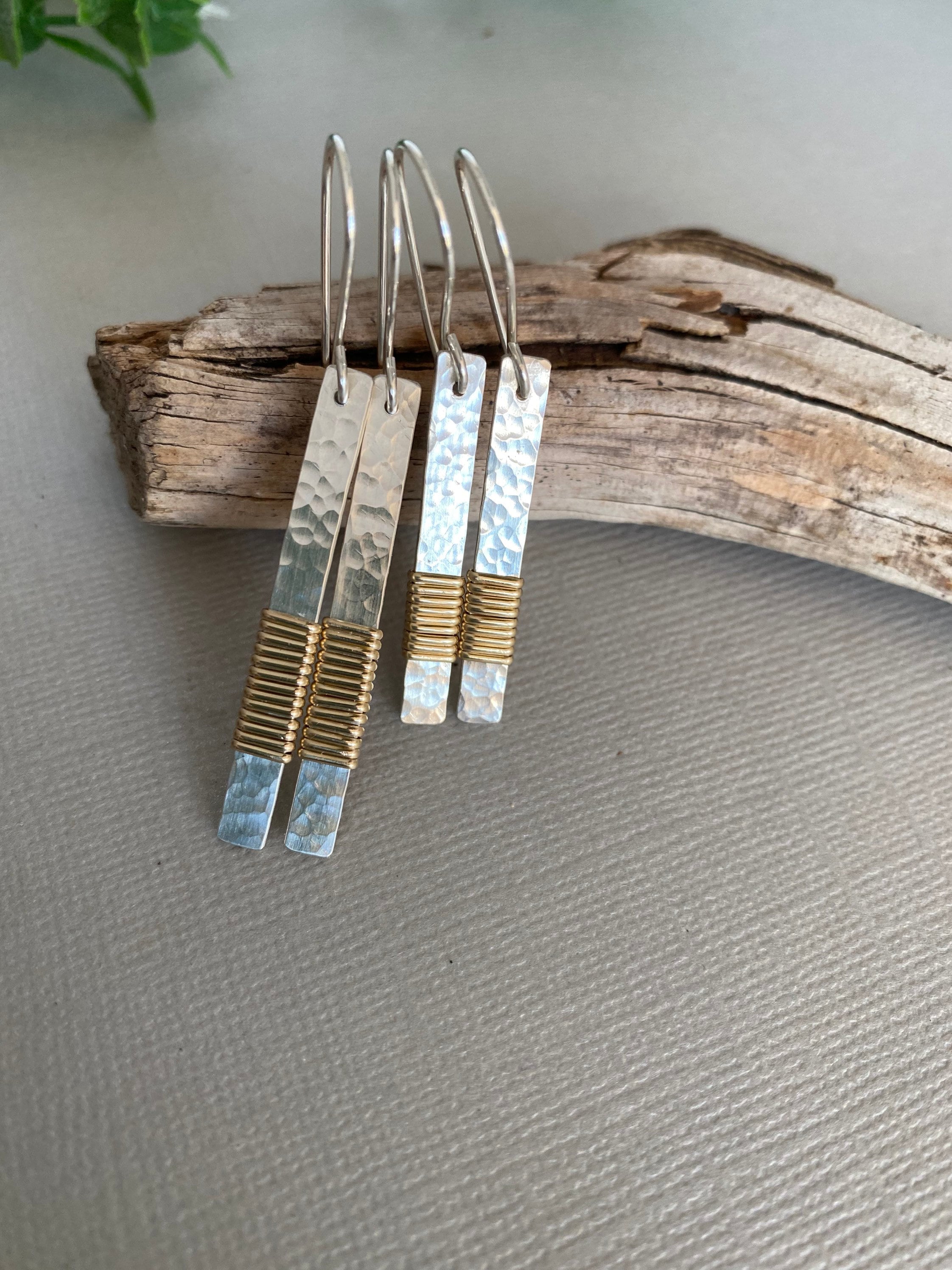 The delicate sterling silver dangles are hammered by hand to reflect lots of light and then wrapped in gold filled wire. These earrings can go with your gold or silver jewelry!