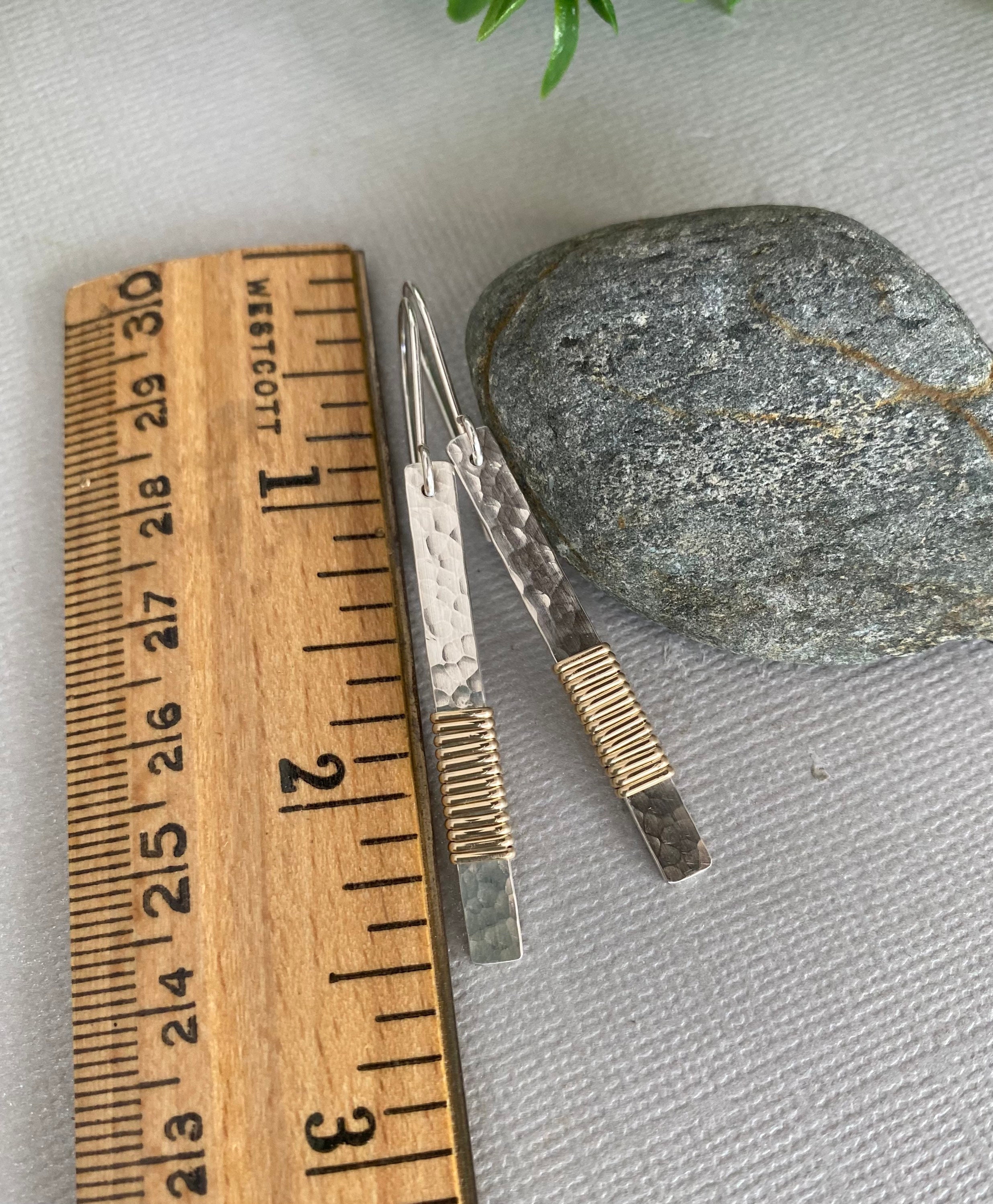They are 1 and 7/8 inches long from the top of the ear wires to the bottom of the earrings. The silver dangles are about 1 and 1/4 inch long. They are 4mm or 3/16 of an inch wide. They dangle gracefully from handmade sterling silver ear wires. These earrings are currently in stock and can be shipped in 1 - 3 days.