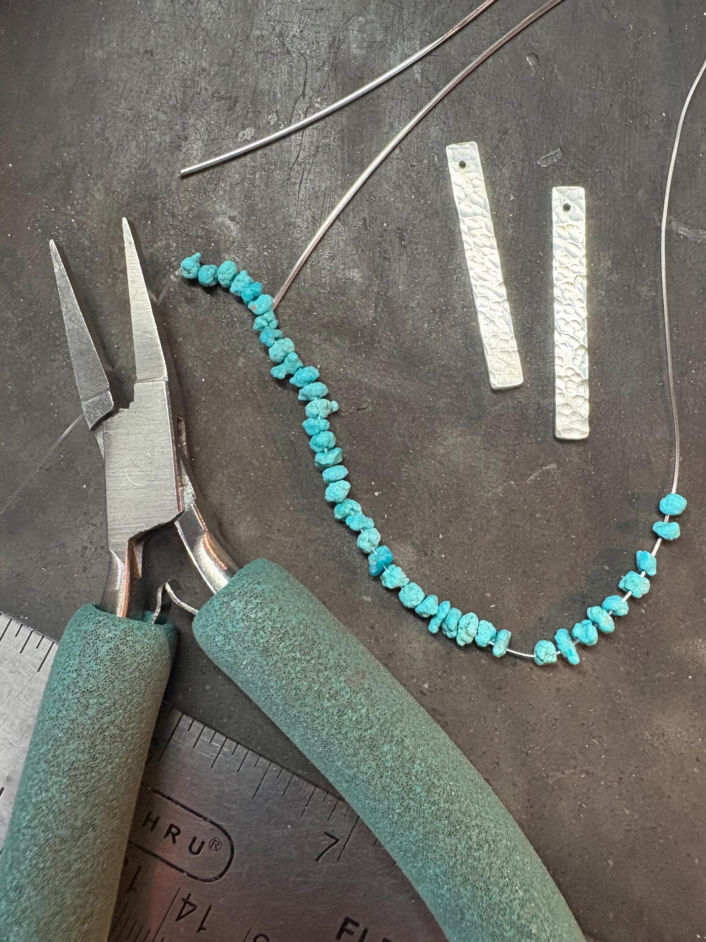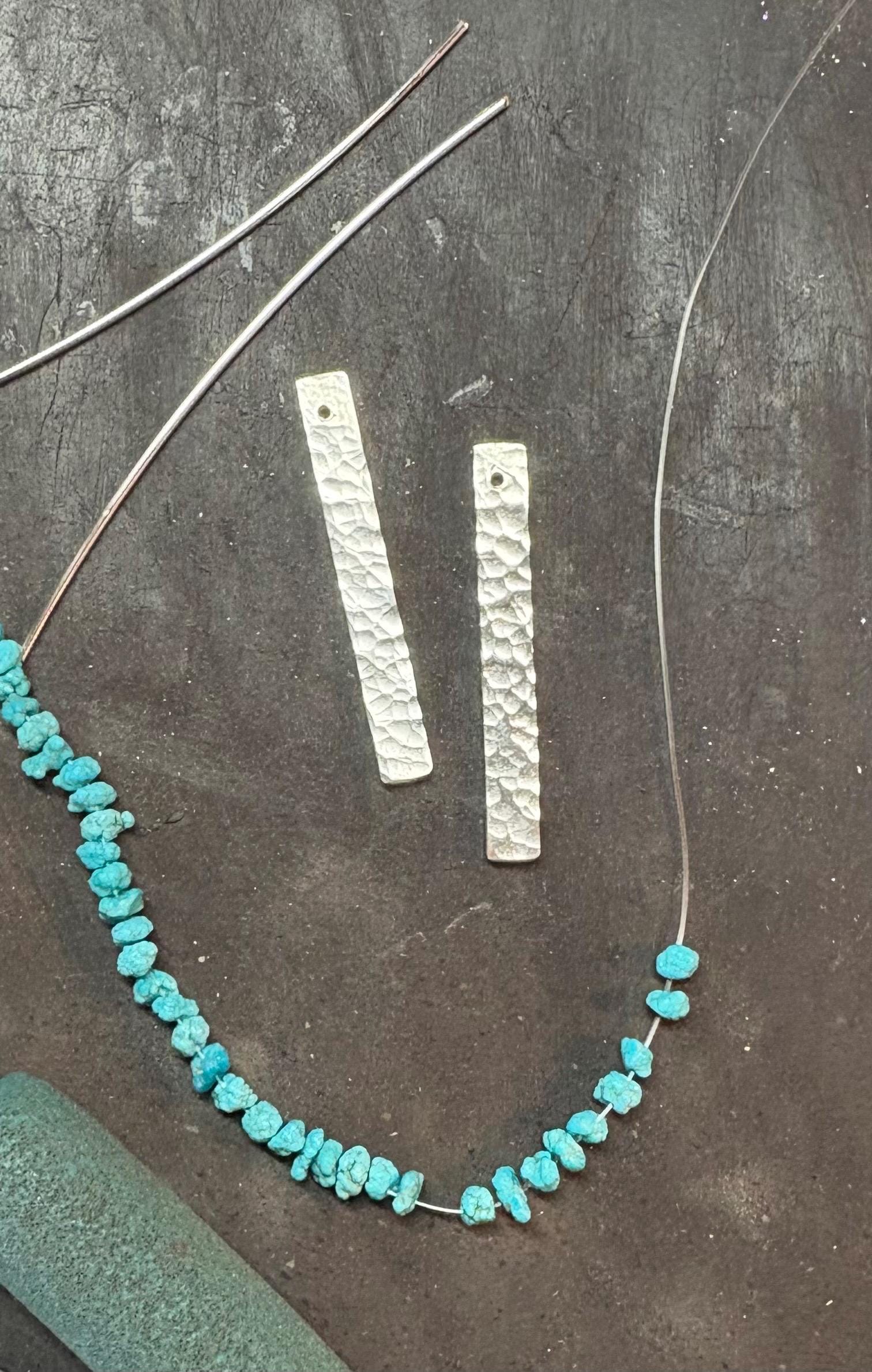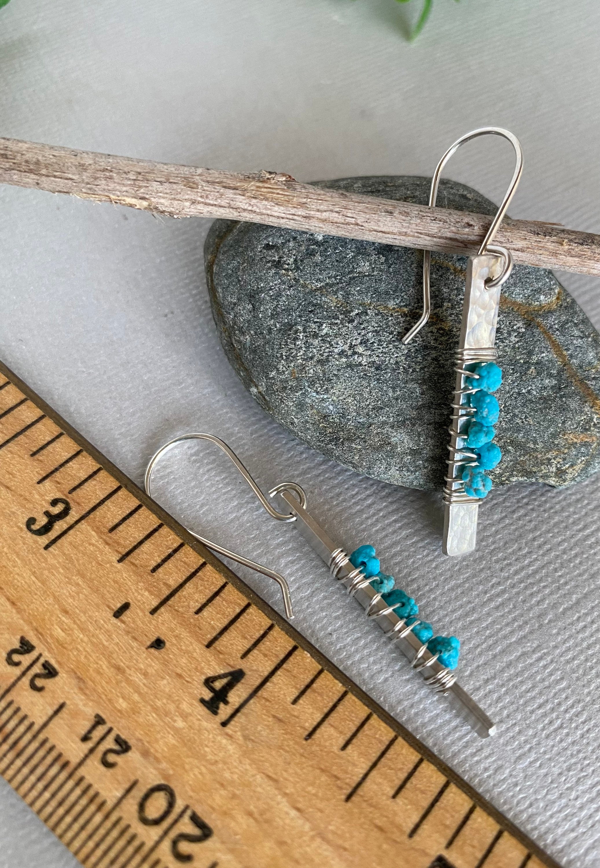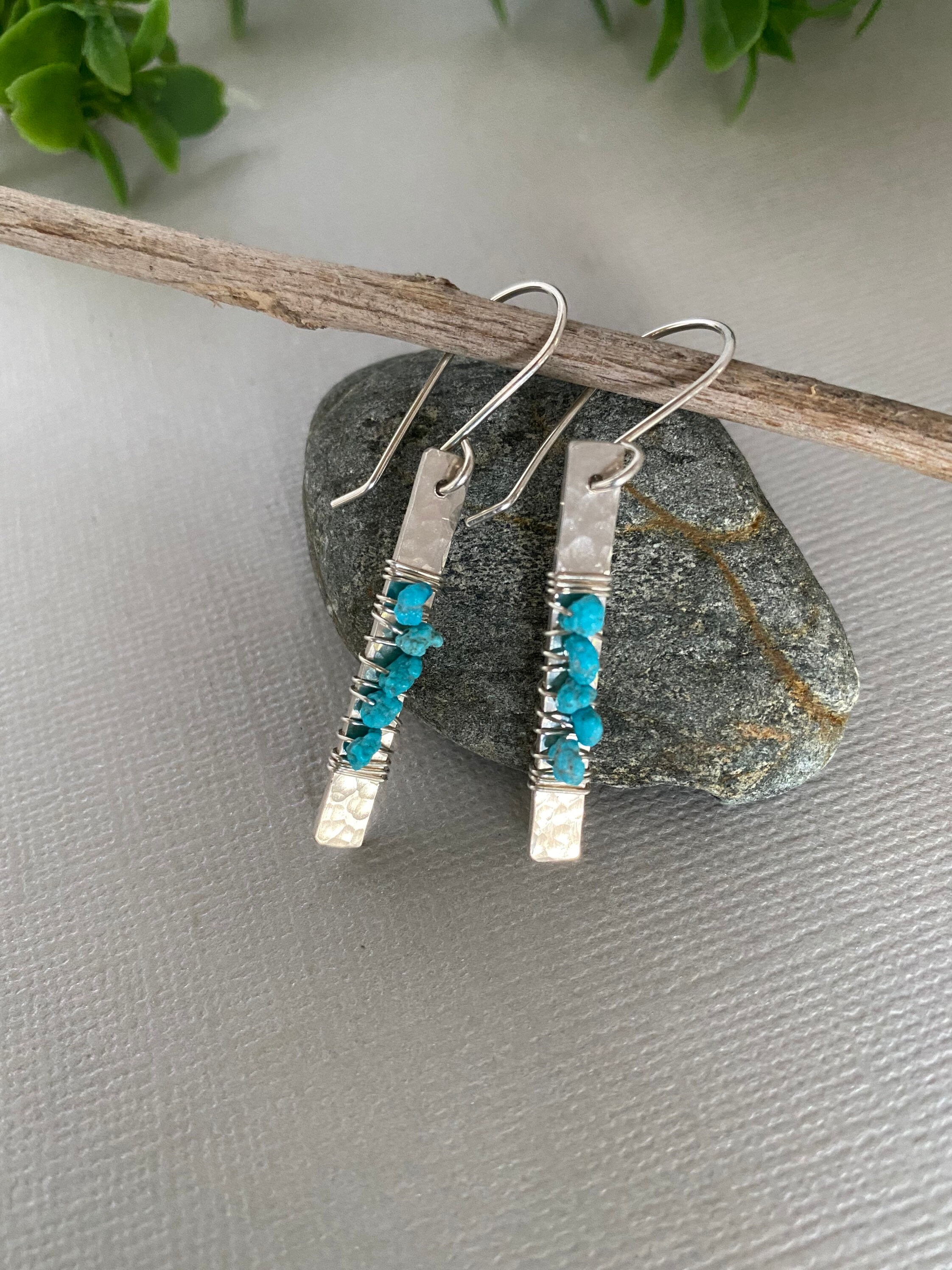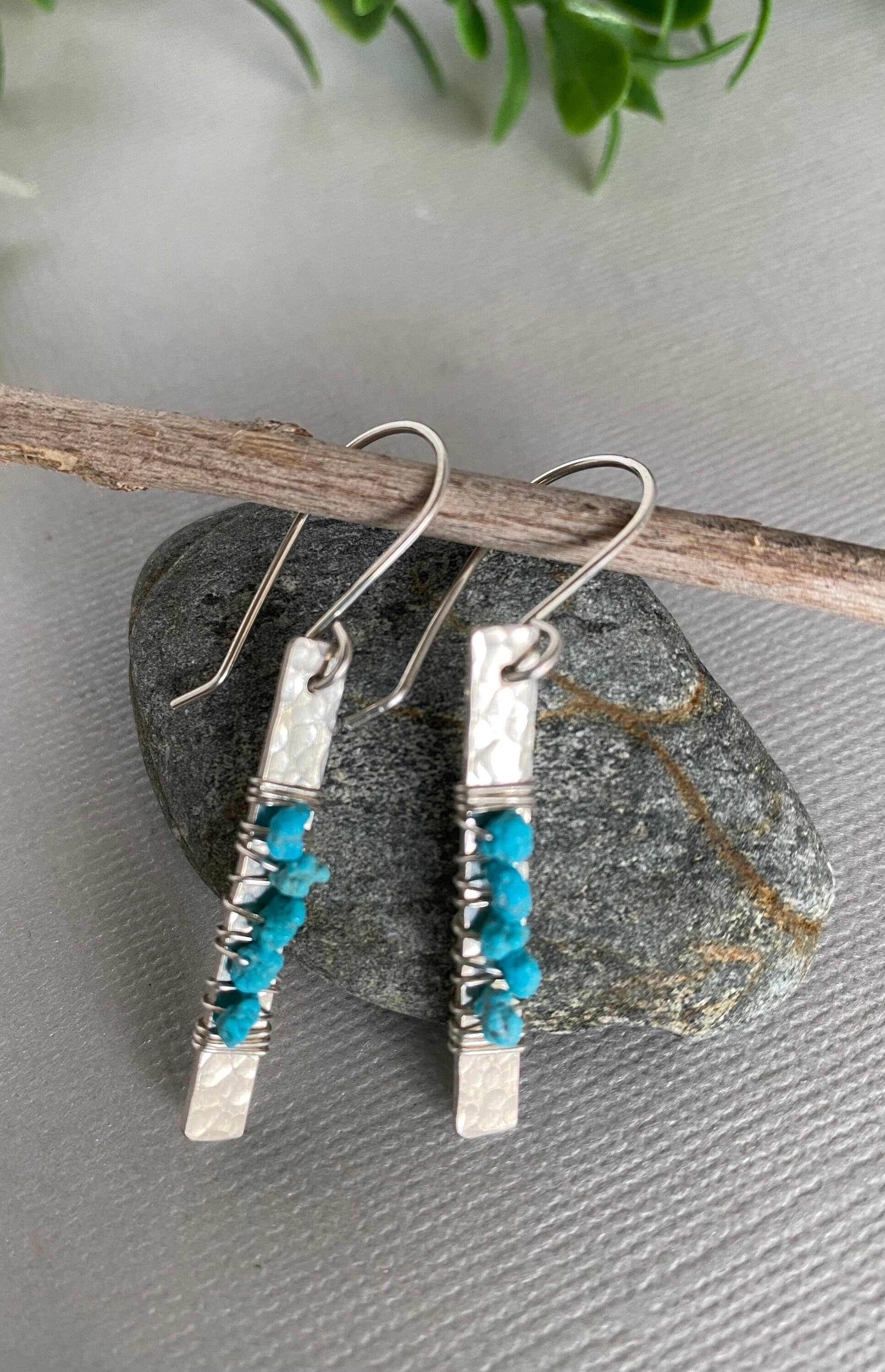 The sterling silver dangles are hammered by hand to reflect lots of light. Then 5 - 2mm real turquoise nuggets are wrapped around the rectangles with sterling silver wire.