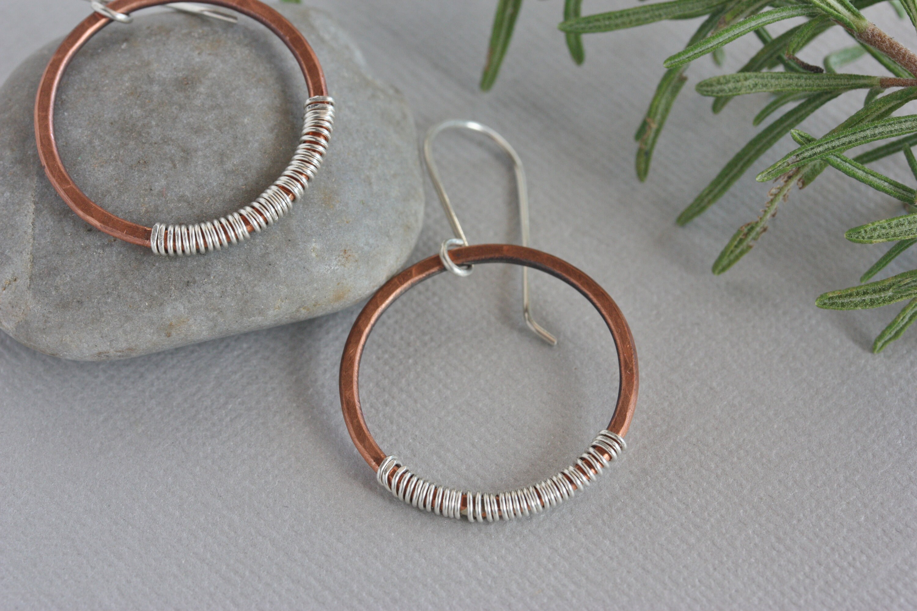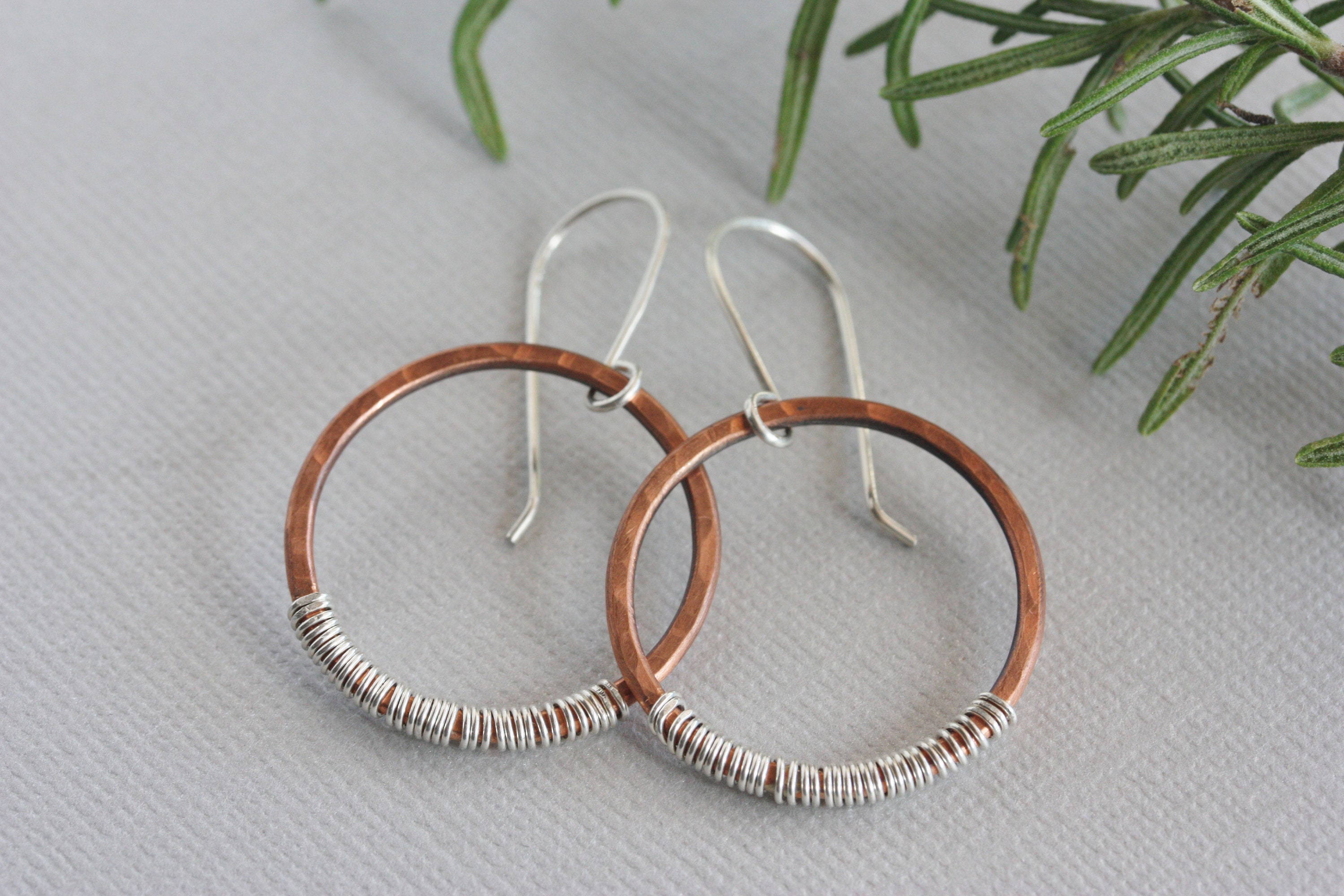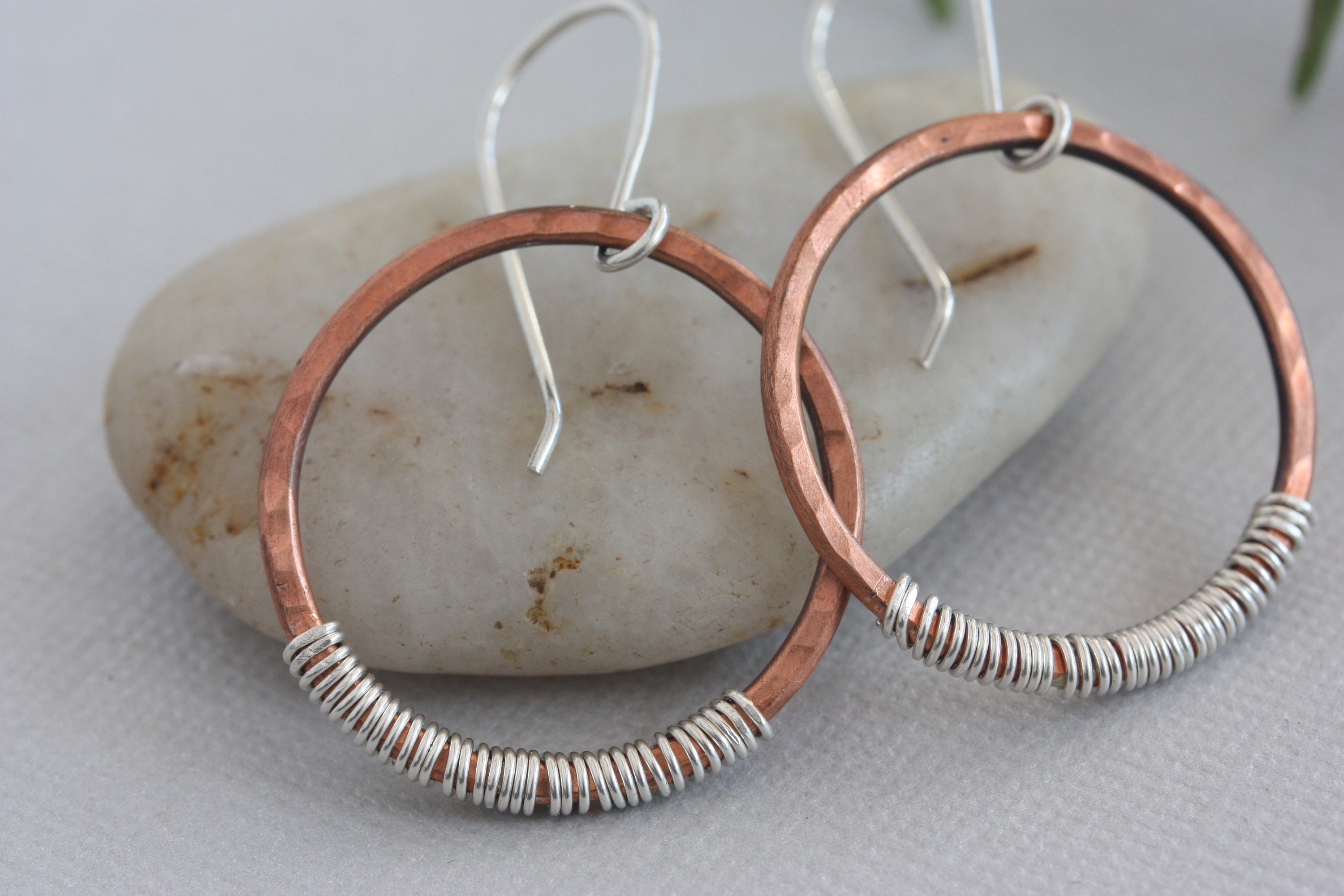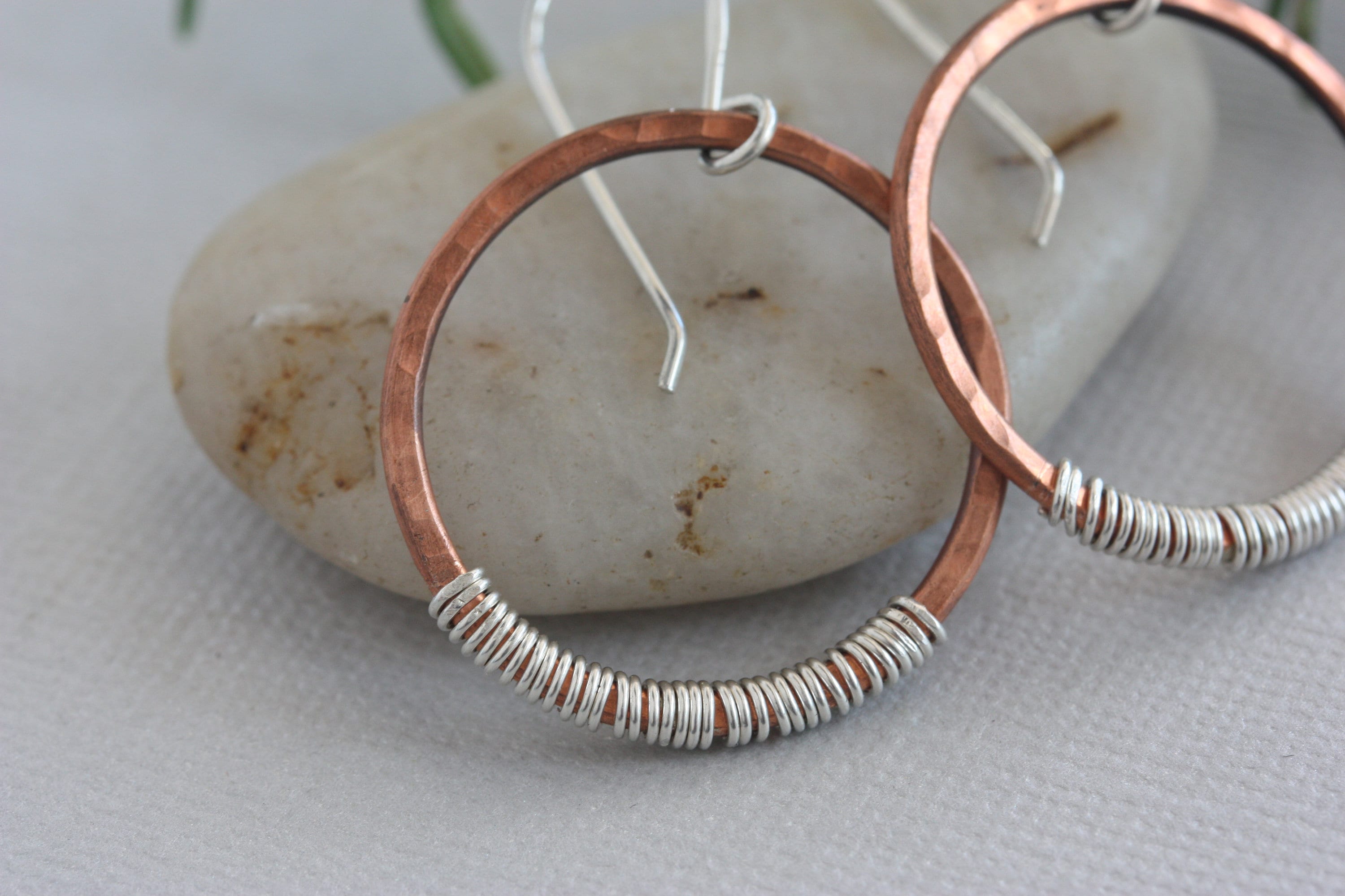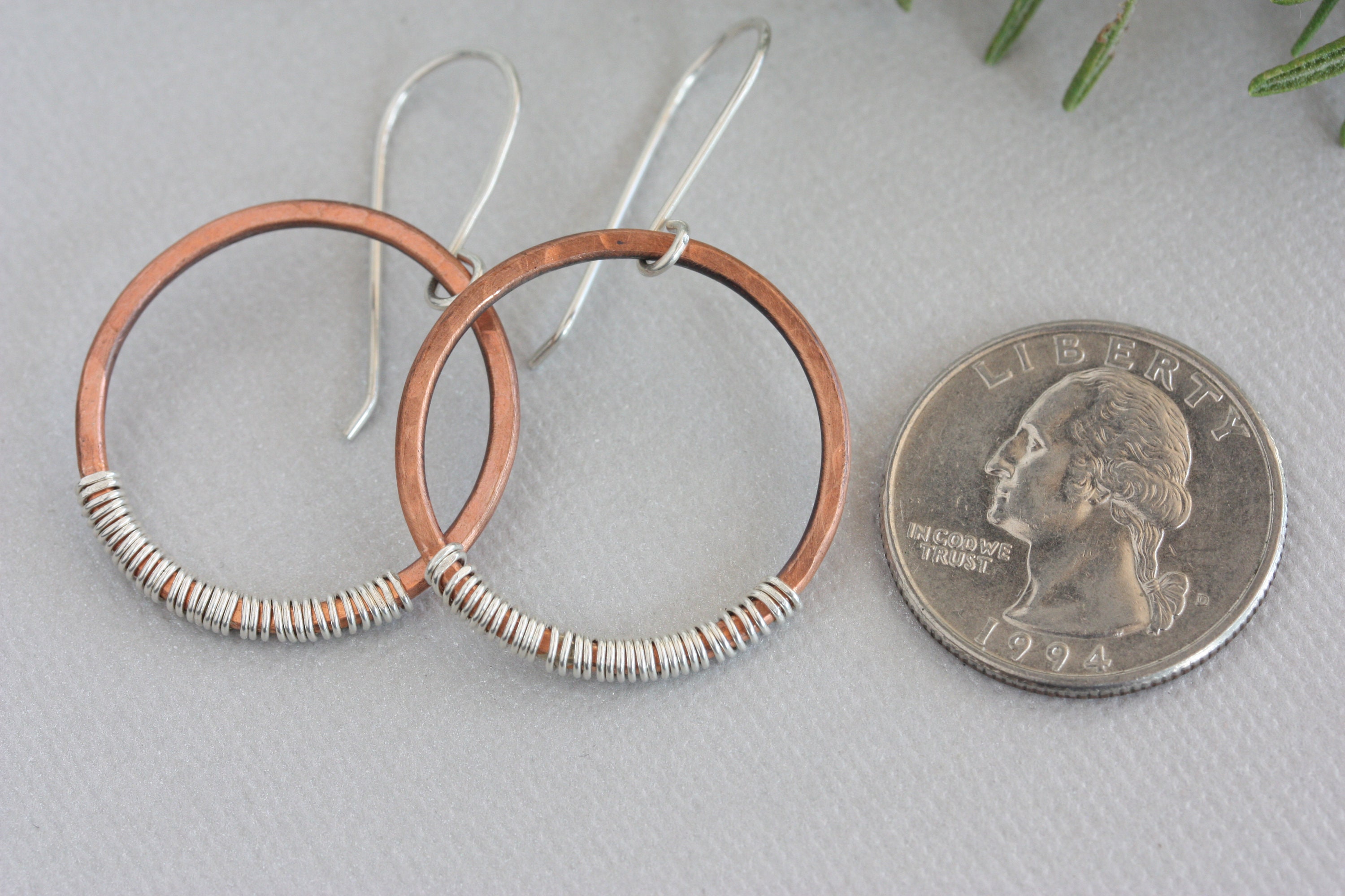 These mixed metal hoop earrings are hand forged from pure copper wire in a perfect circle and hammered lightly for some great texture. They are then wrapped in sterling silver wire on the bottom of the circles. These fun earrings are finished with a hand made pair of sterling silver ear wires. Great choice when you can't decide on what to wear, copper or silver. Wear both!!