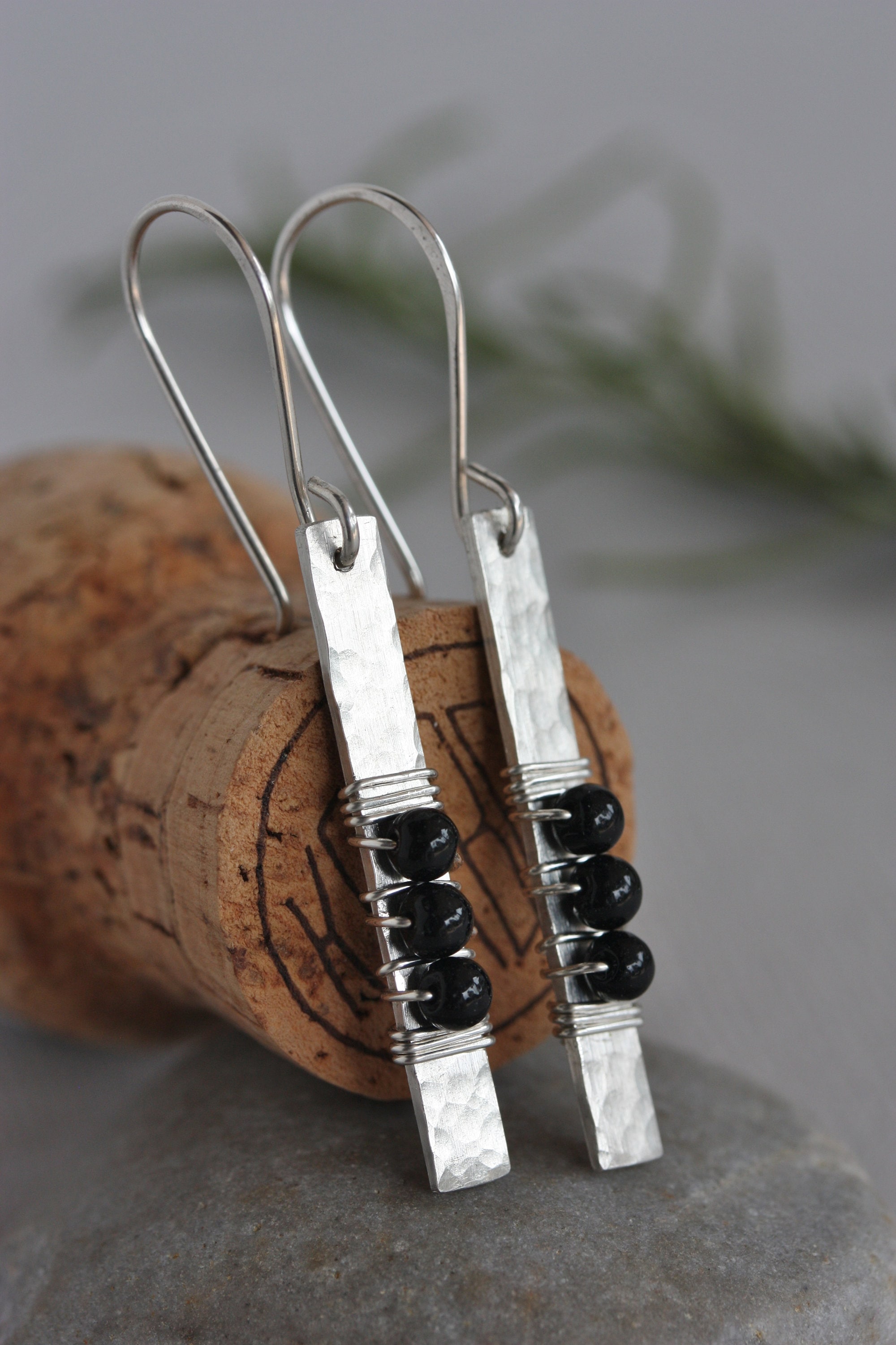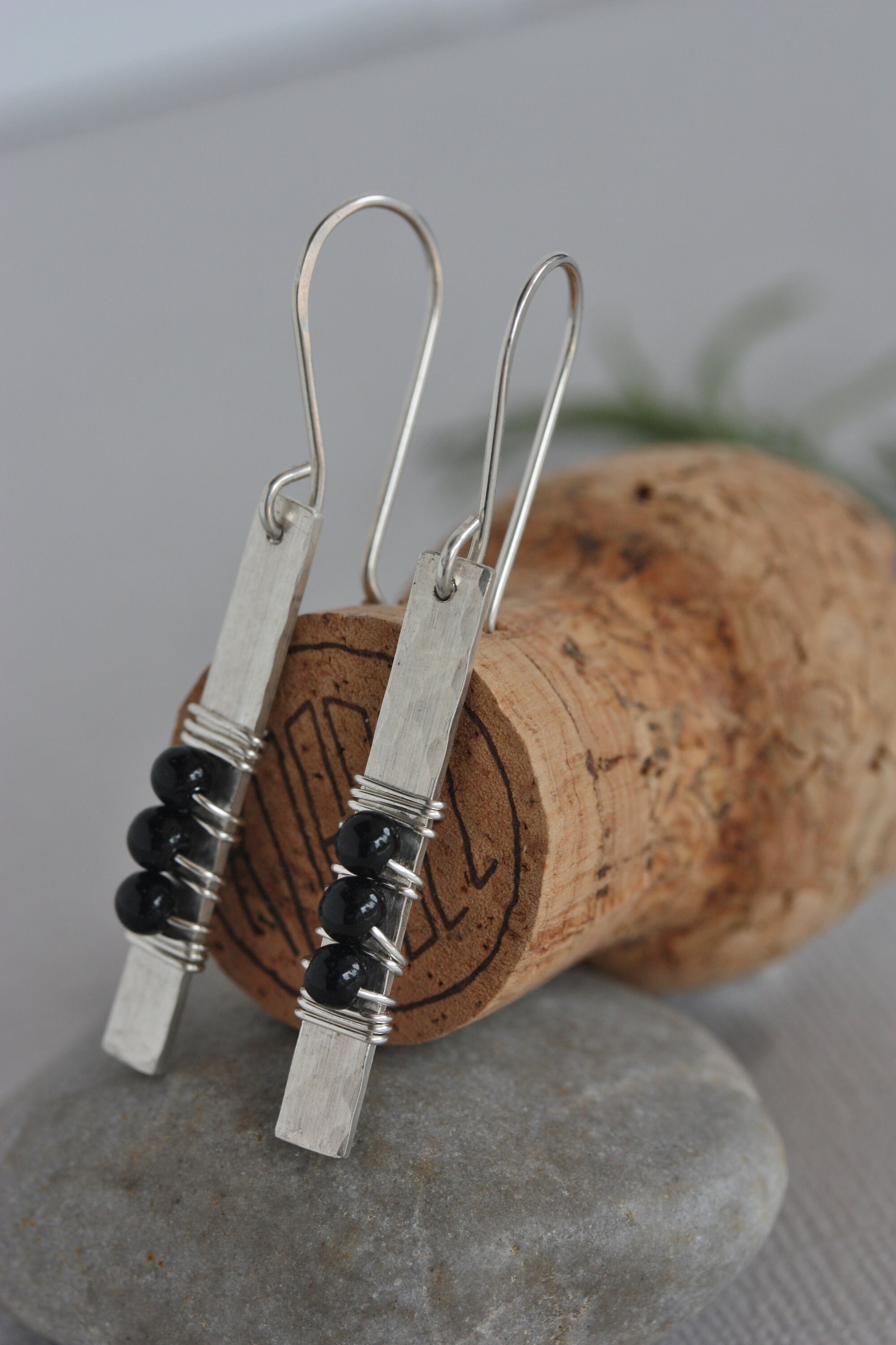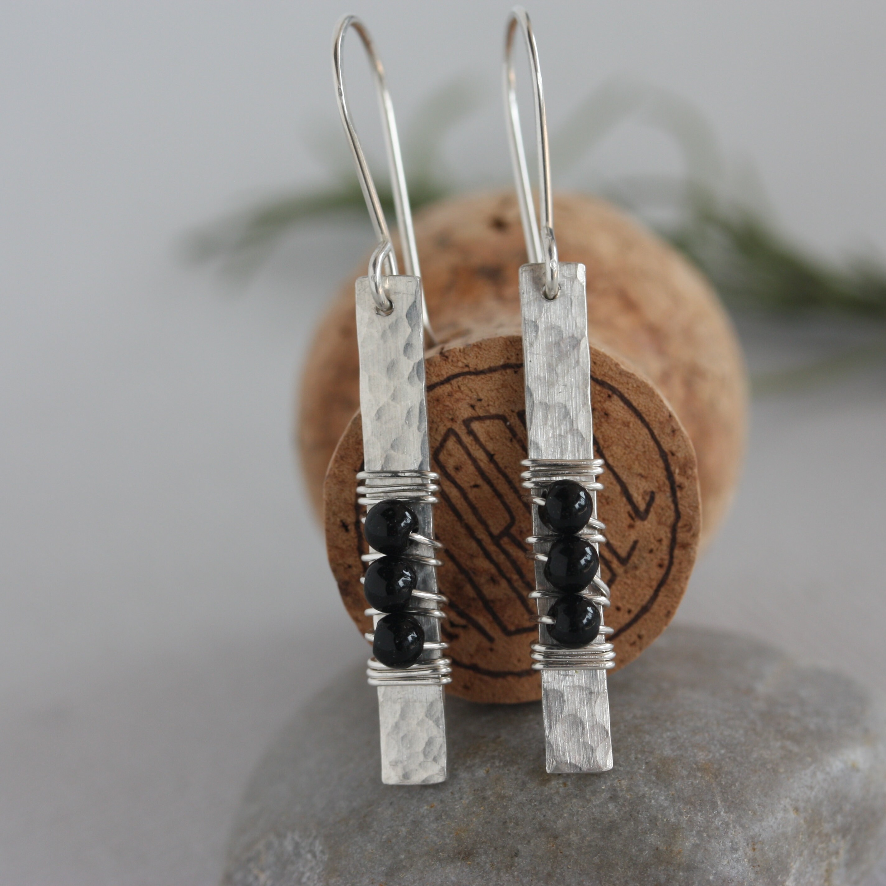 The sterling silver dangles are hand cut from a 4mm piece of flat wire and hammered to reflect lots of light. The onyx beads are wrapped around the rectangles with sterling silver wire.
