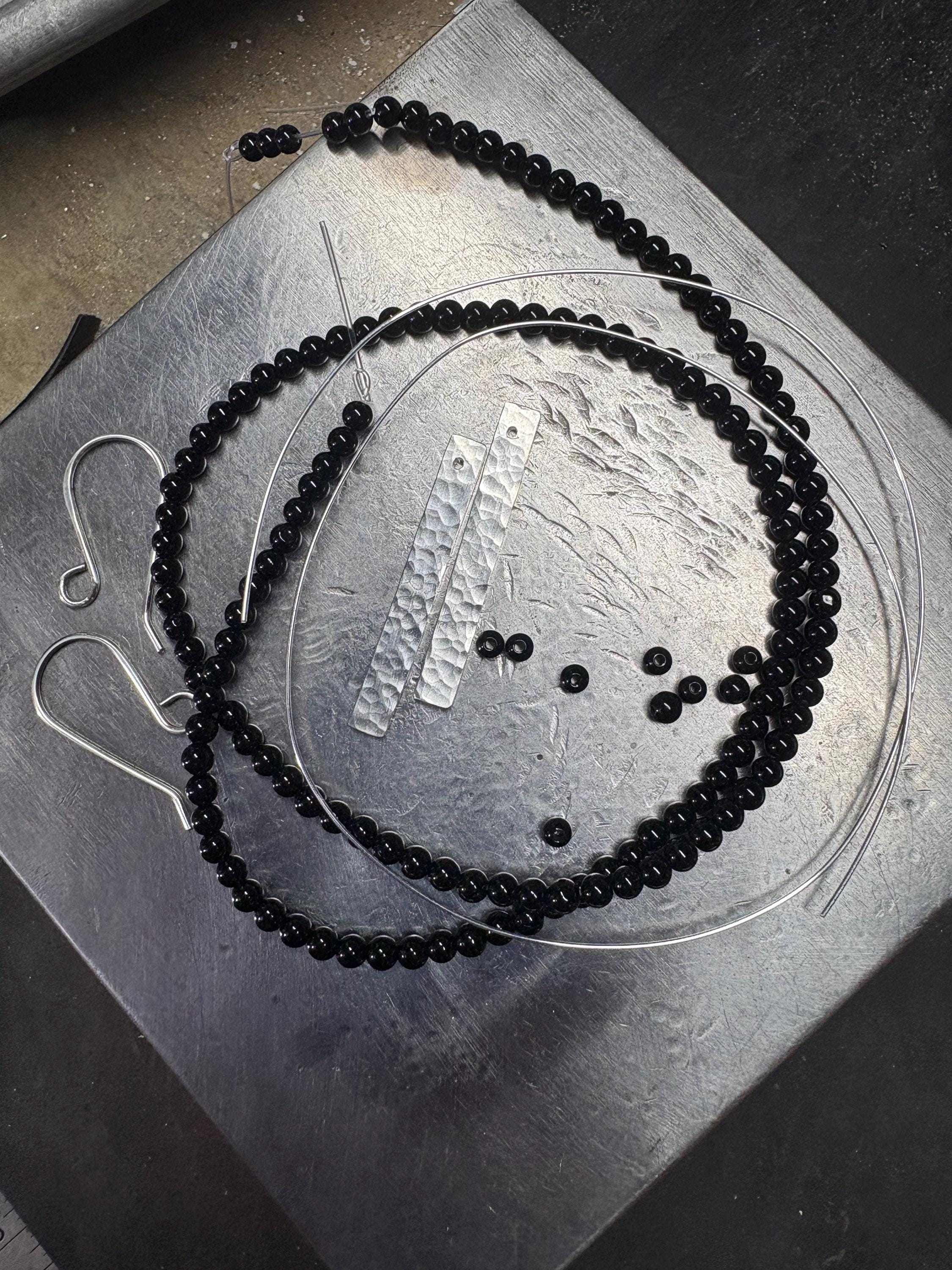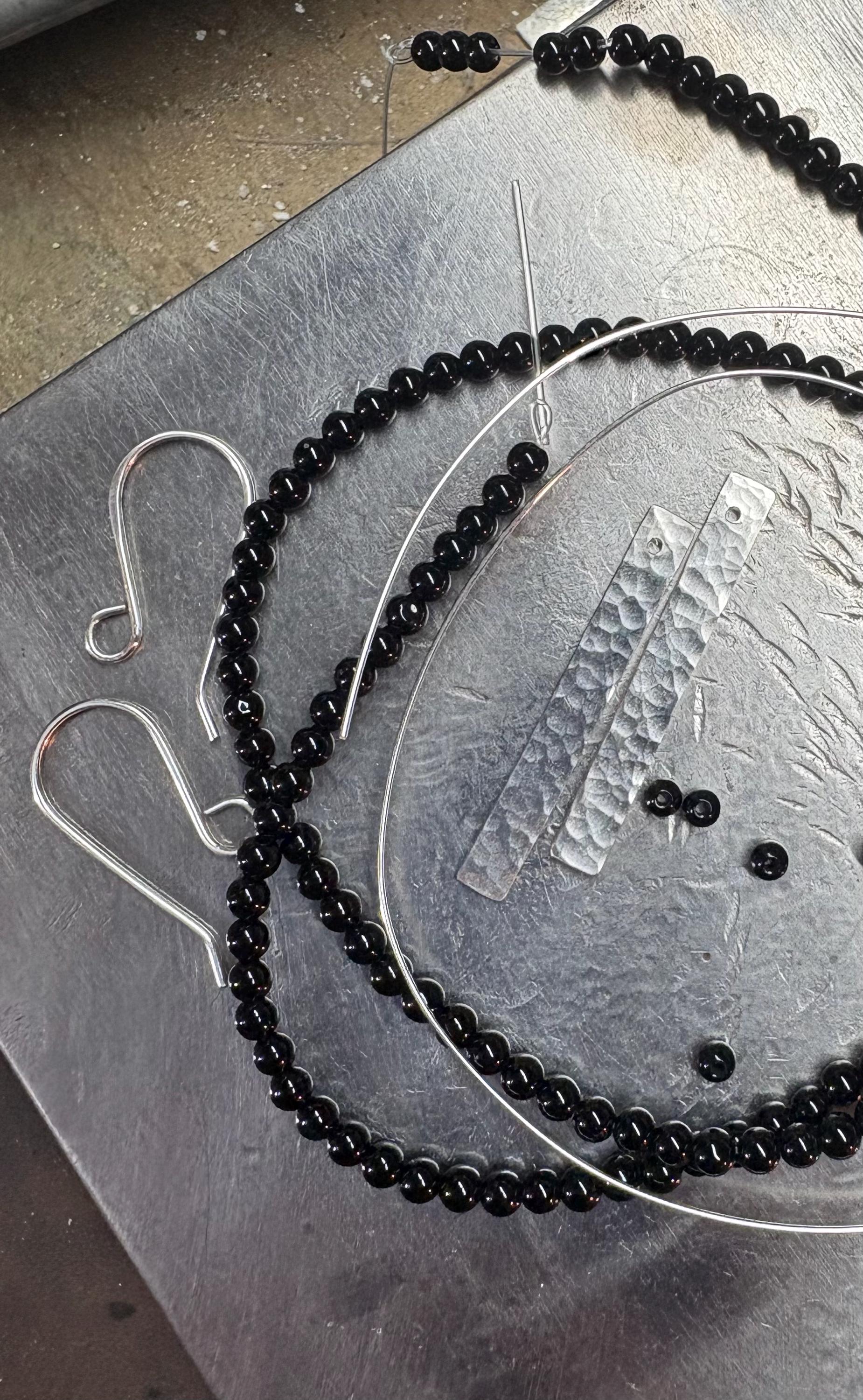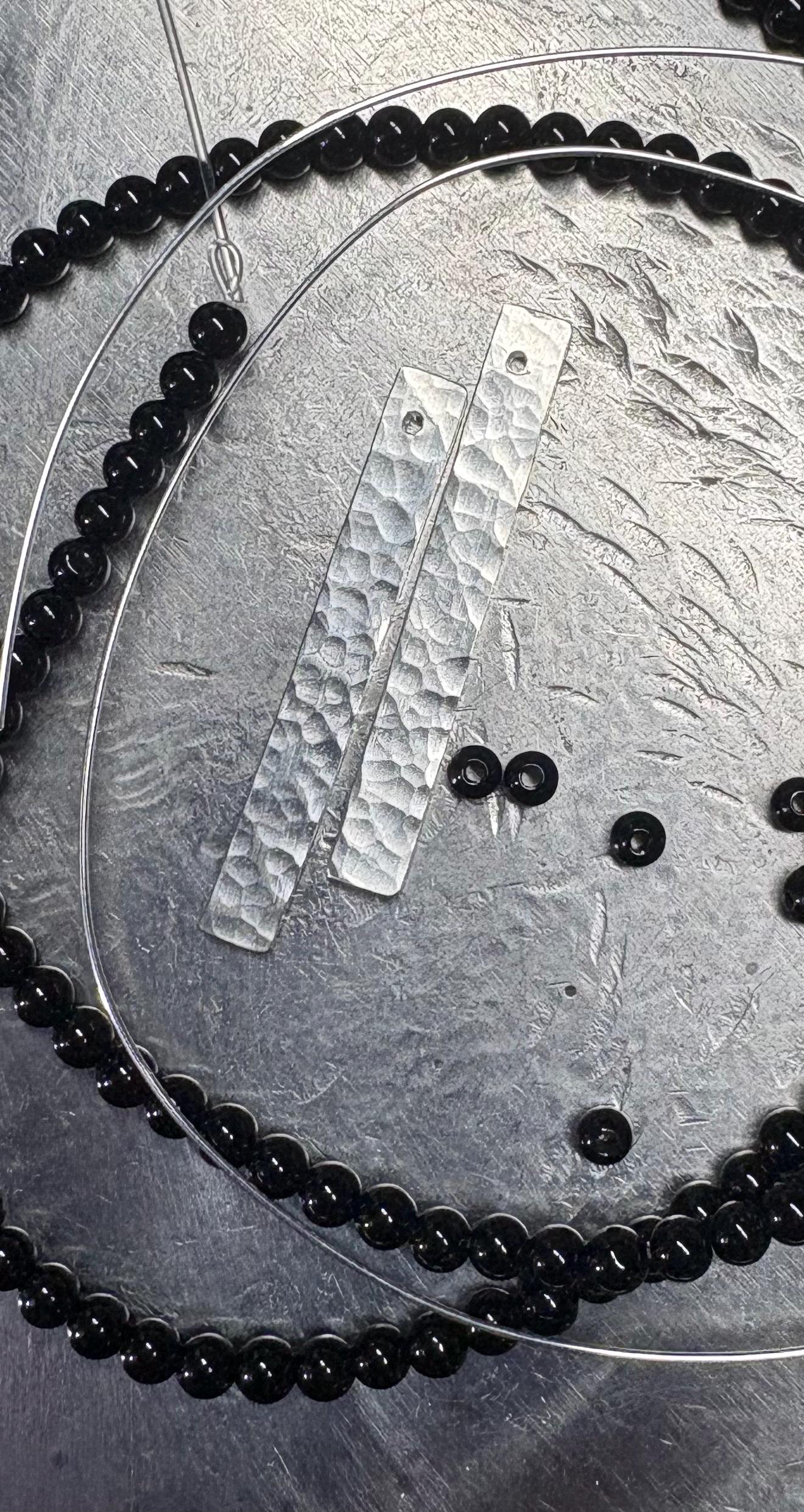 The sterling silver dangles are hand cut from a 4mm piece of flat wire and hammered to reflect lots of light. The onyx beads are wrapped around the rectangles with sterling silver wire.