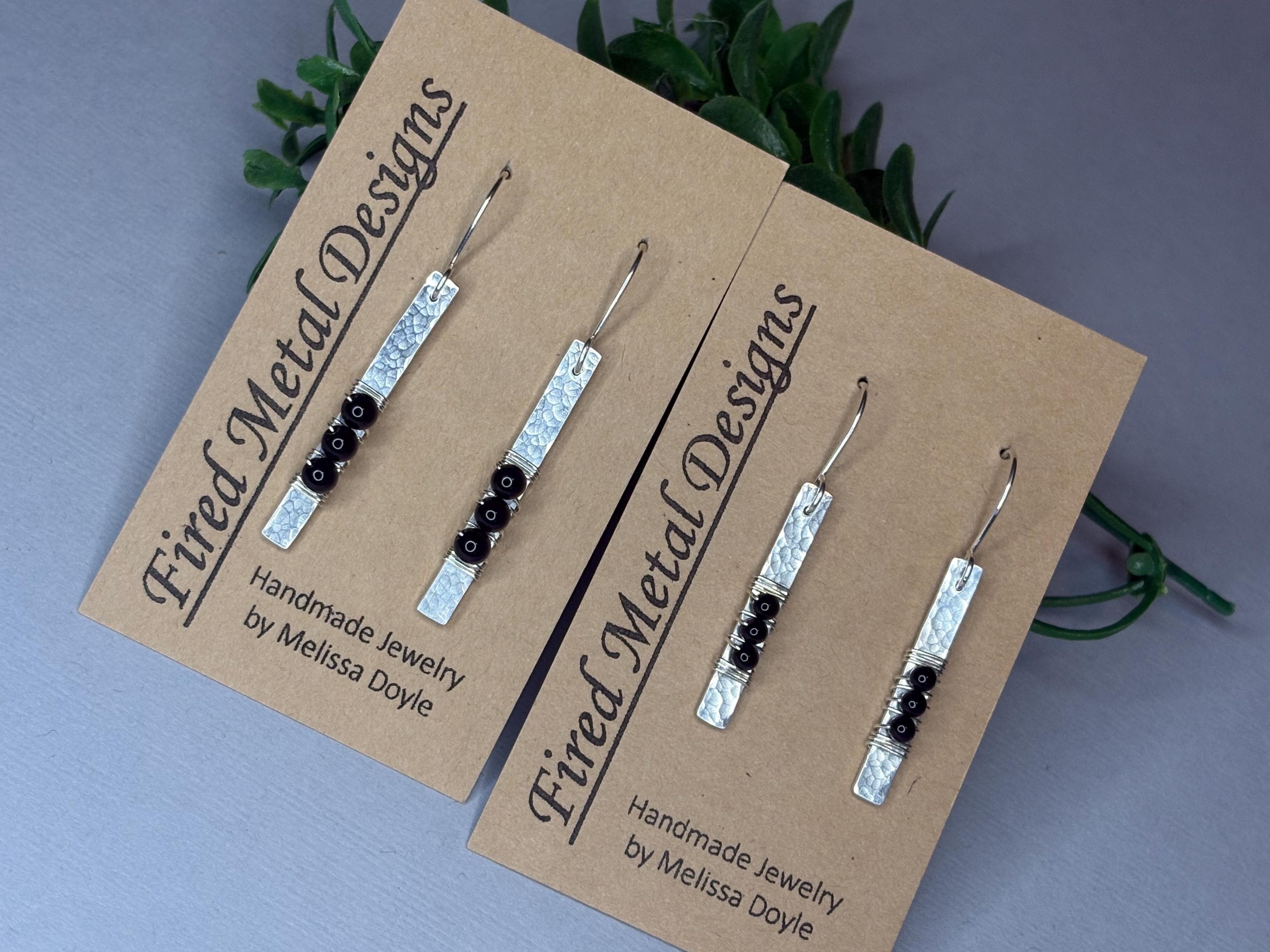The 1.25" earrings are 1 and 7/8 inches long from the top of the ear wire to the bottom of the earring. The silver dangles are 1 and 1/4 inch long and 4 mm wide or 3/16 of an inch. The onyx beads are 3 mm. Both variations dangle gracefully from handmade sterling silver ear wires.