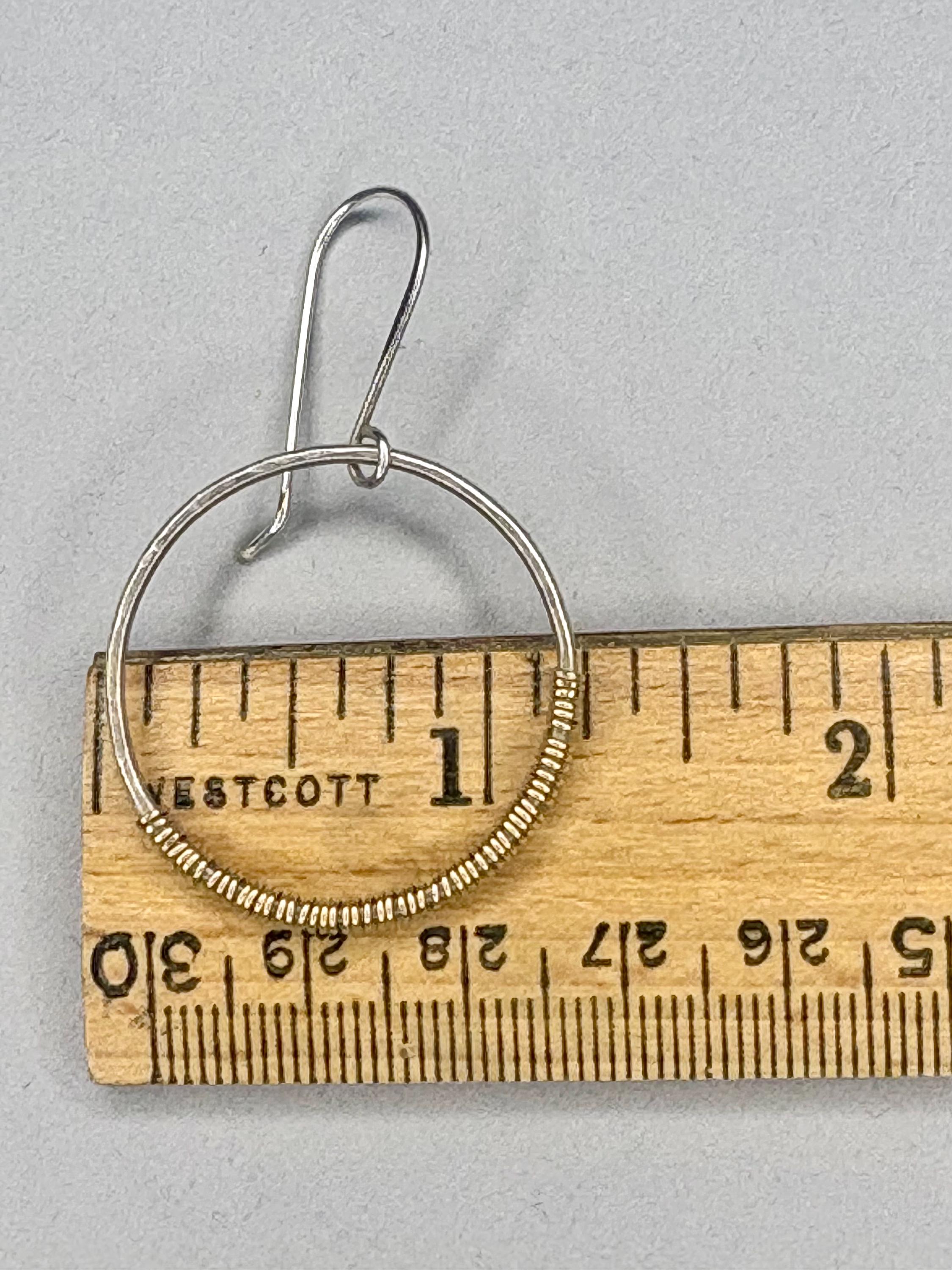 The hoops are about 1 and 1/4 inch wide and dangle from top to bottom at about 1 and 3/4 inches. They dangle from handmade sterling silver ear wires. Wear them with your silver or gold jewelry!