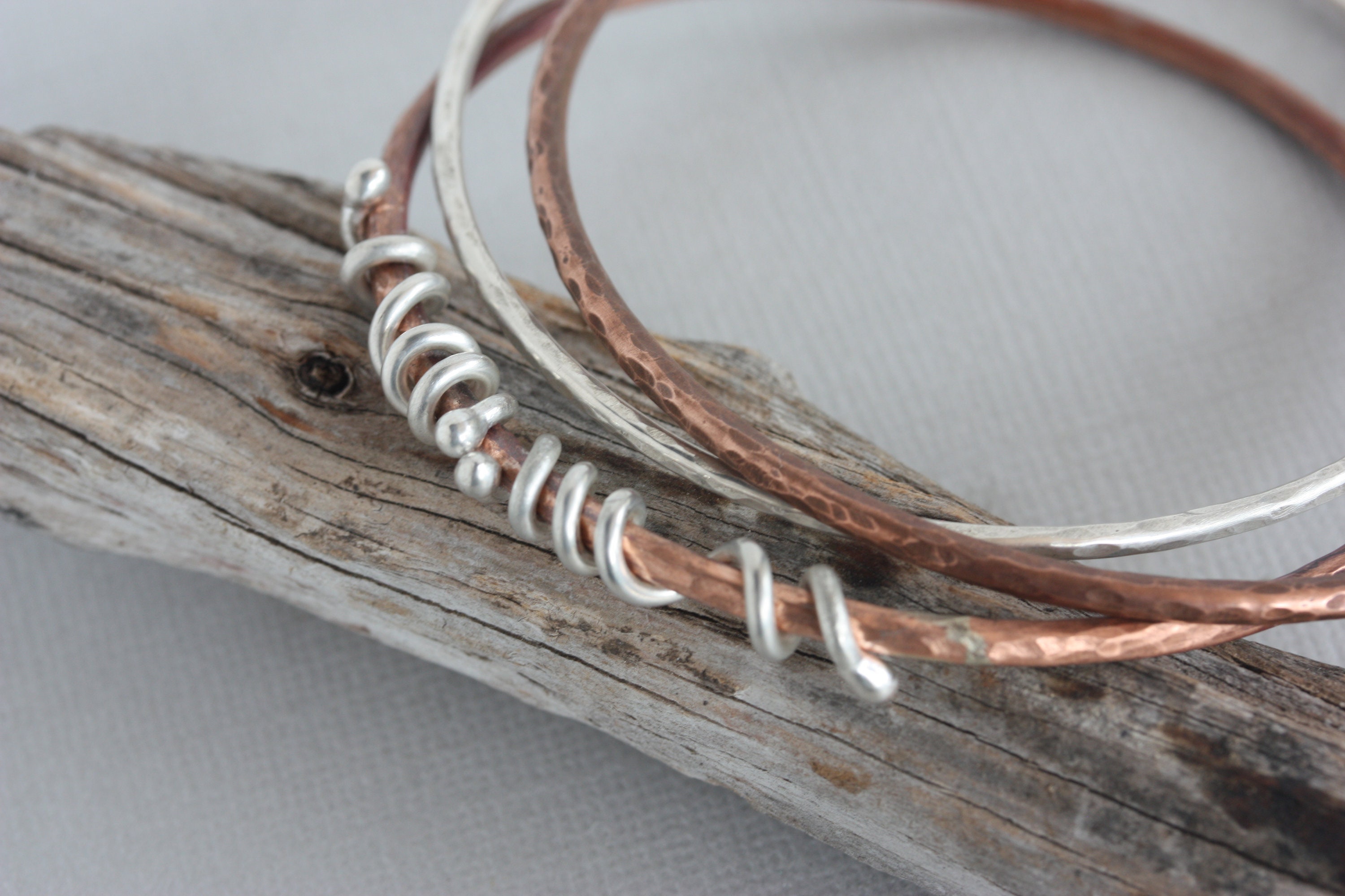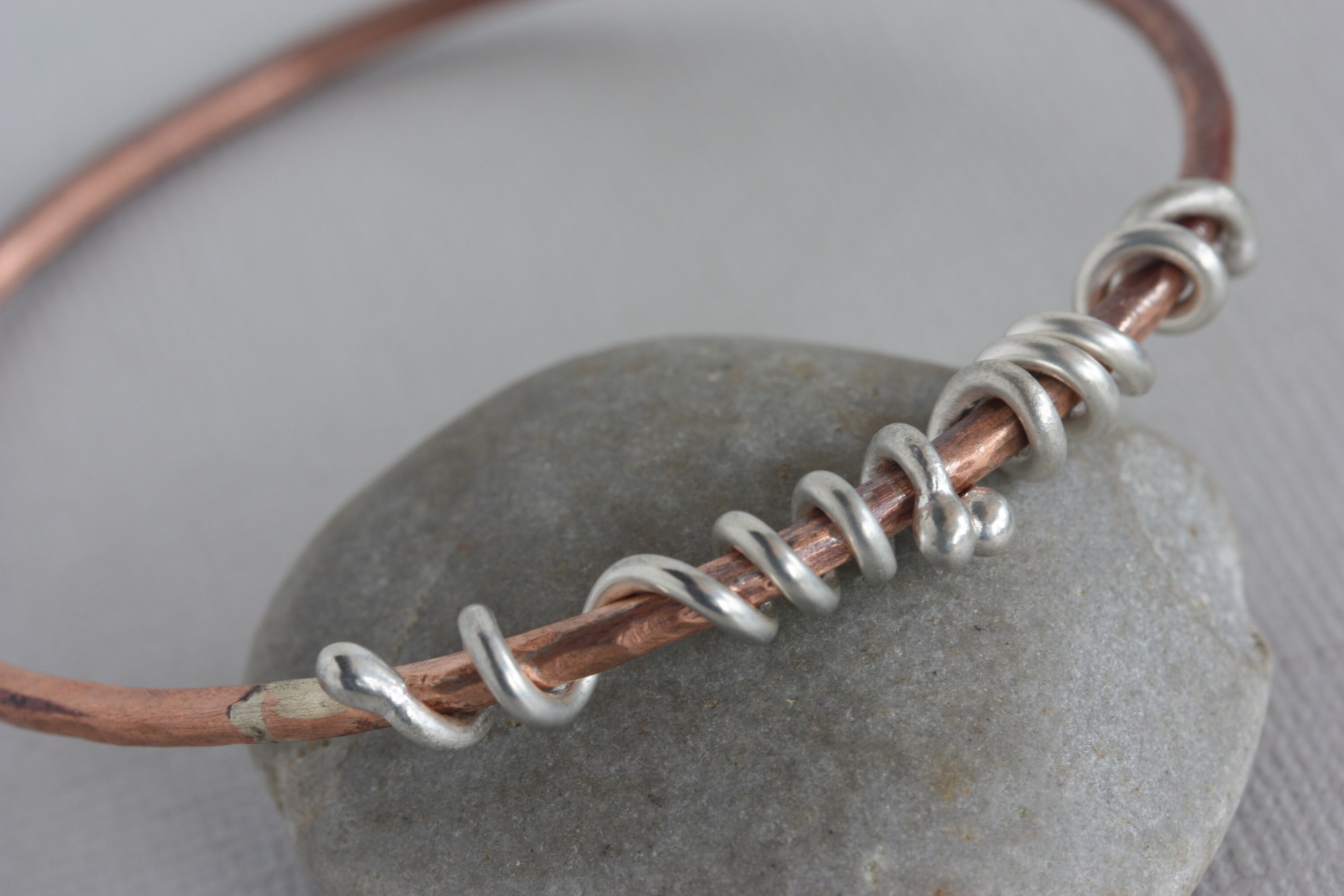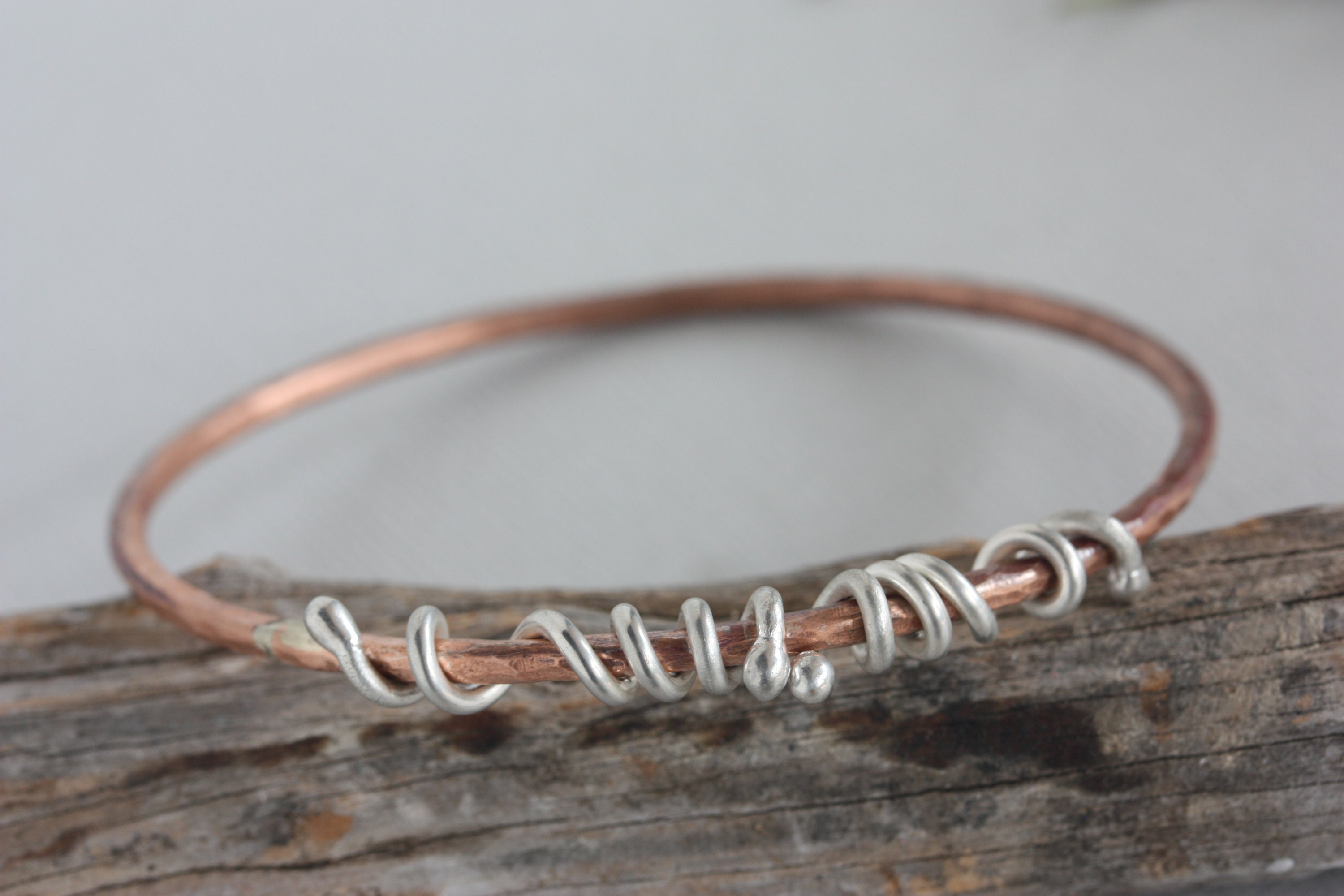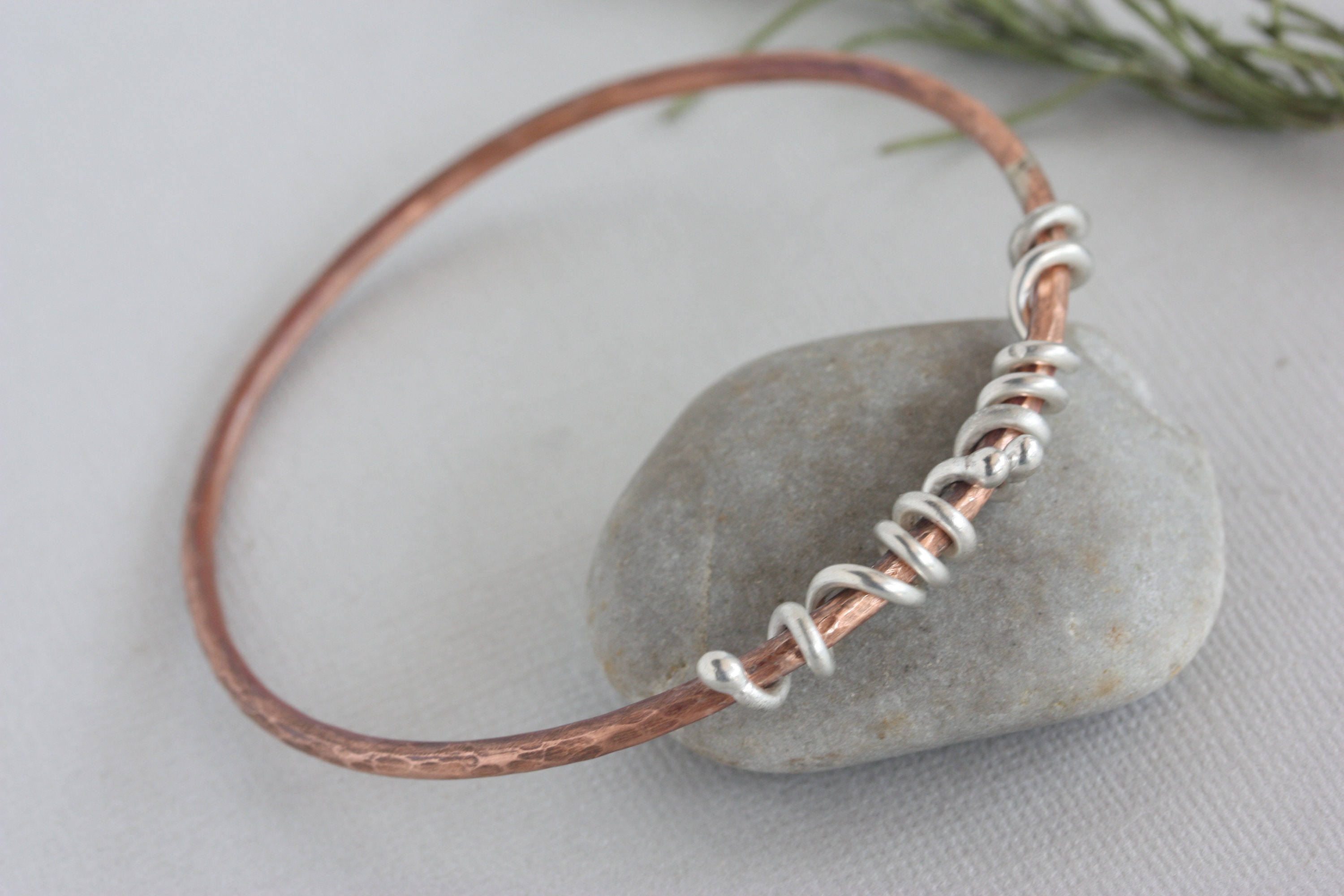 A simple 10 gauge copper wire is hand soldered and textured to create a beautiful and light weight bangle bracelet. It is adorned with sterling silver wire wrapped around the edges to add some shiny accents and contrast. This bangle would be a great addition to your collection of stacking bangles! Wear it by itself or with lots of other copper or silver bangles. It's about 3 mm wide. See photos of this bangle with some of my other copper and silver bangles that may be purchased separtely.