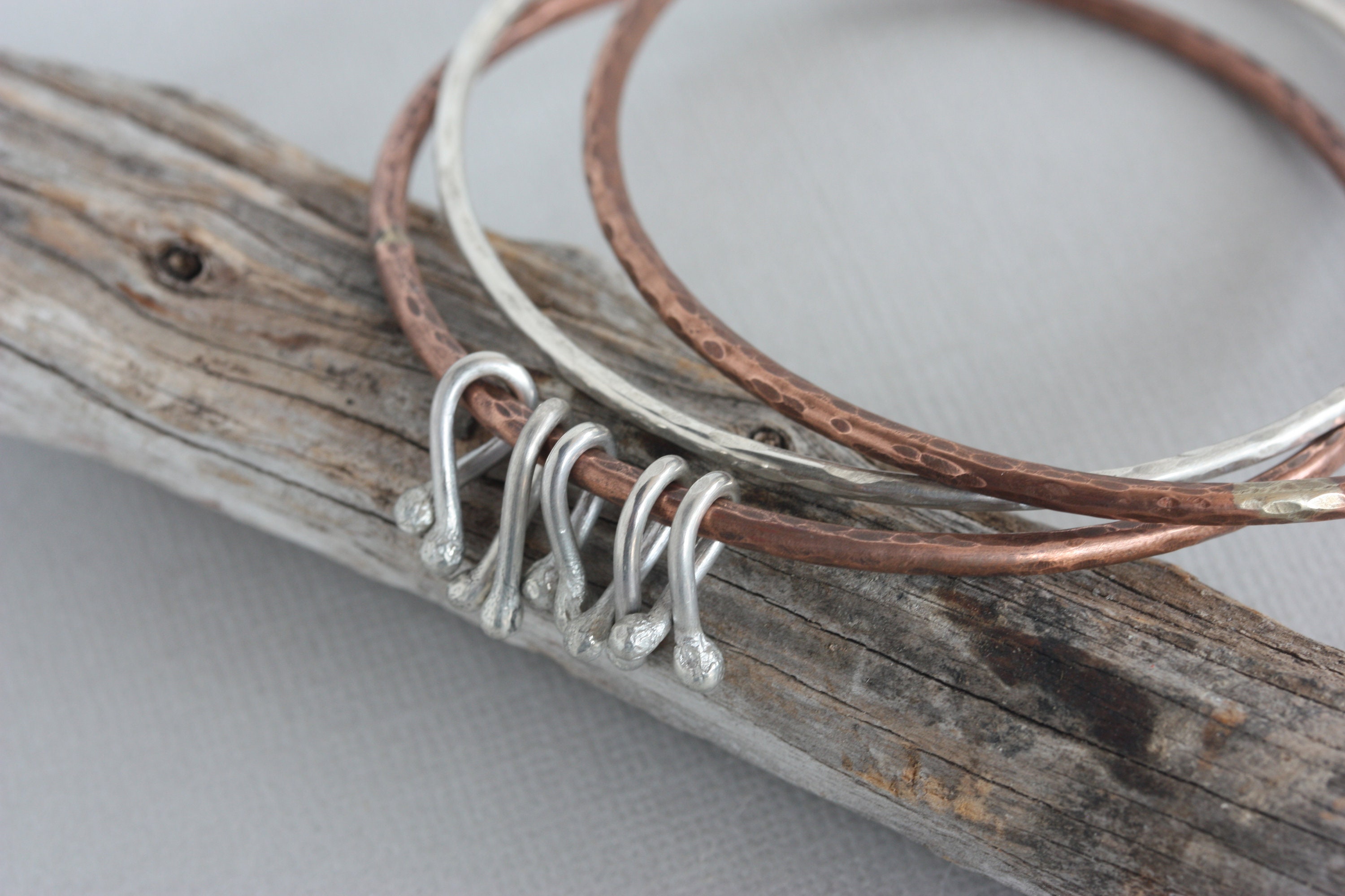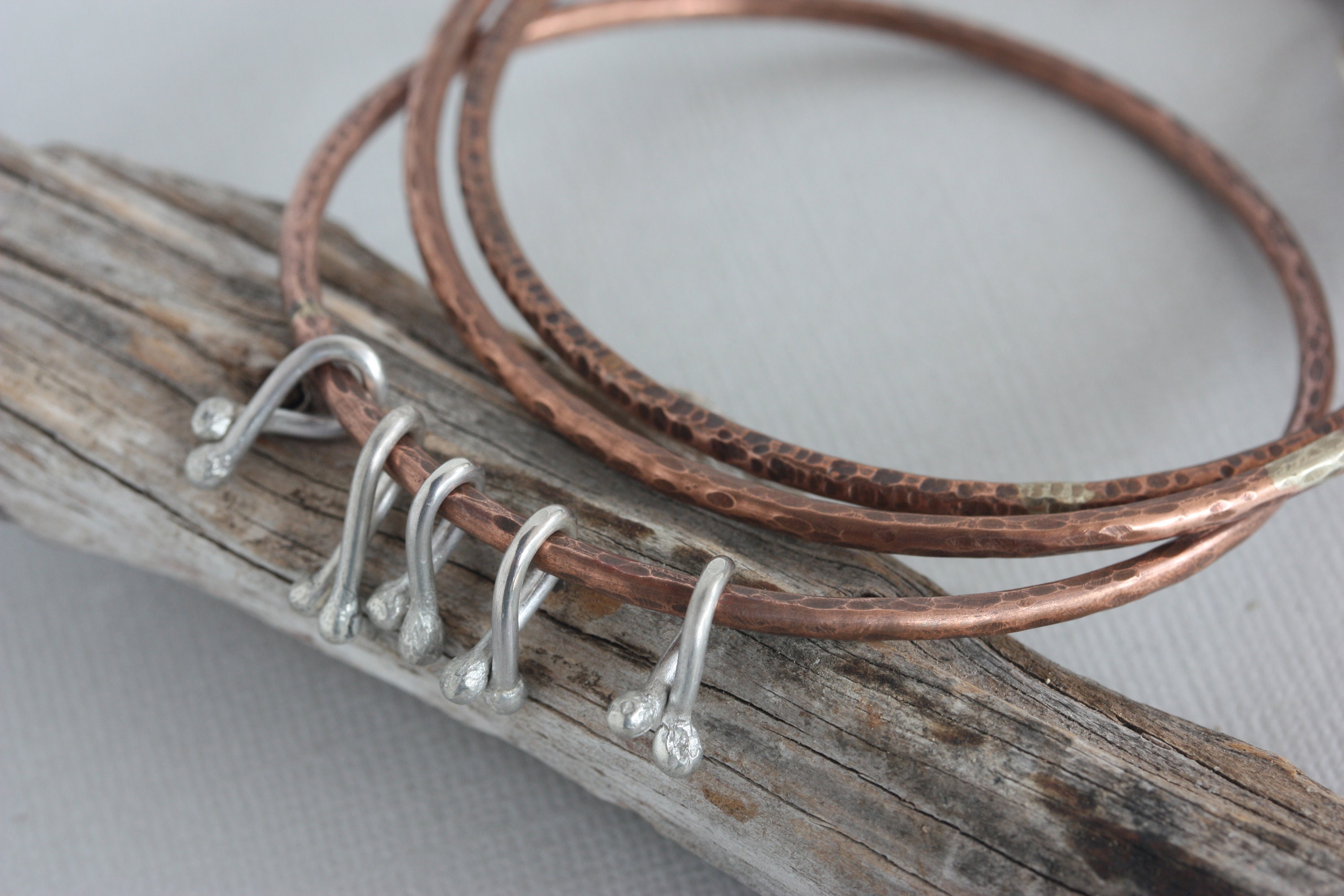 A simple 10 gauge copper wire is hand soldered and textured to create a beautiful and light weight bangle bracelet. It is adorned with handmade sterling silver dangle accents that will "twirl" around your bangle. It is fun to wear and to play with! The listing is for one bangle but is shown in several photos with other handmade bangles from my Etsy store. Pair this bangle with another copper or silver bangle. Or with my sterling silver bangle with a heart charm! You have lots of options with this fun bangle to wear with your collection of bangles or just by itself. It's about 3mm wide and comes in several diameters. See the drop down menu for sizes.