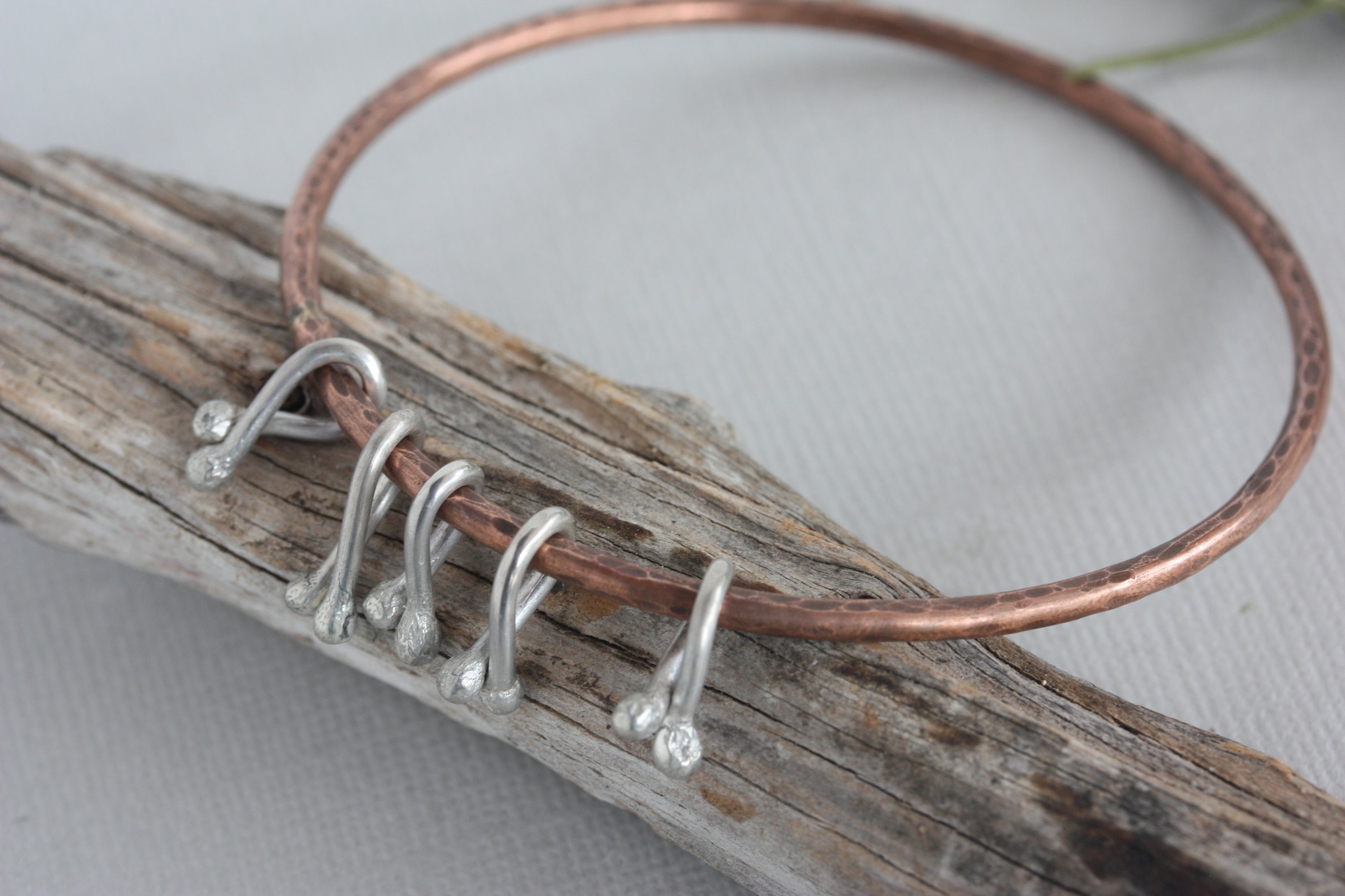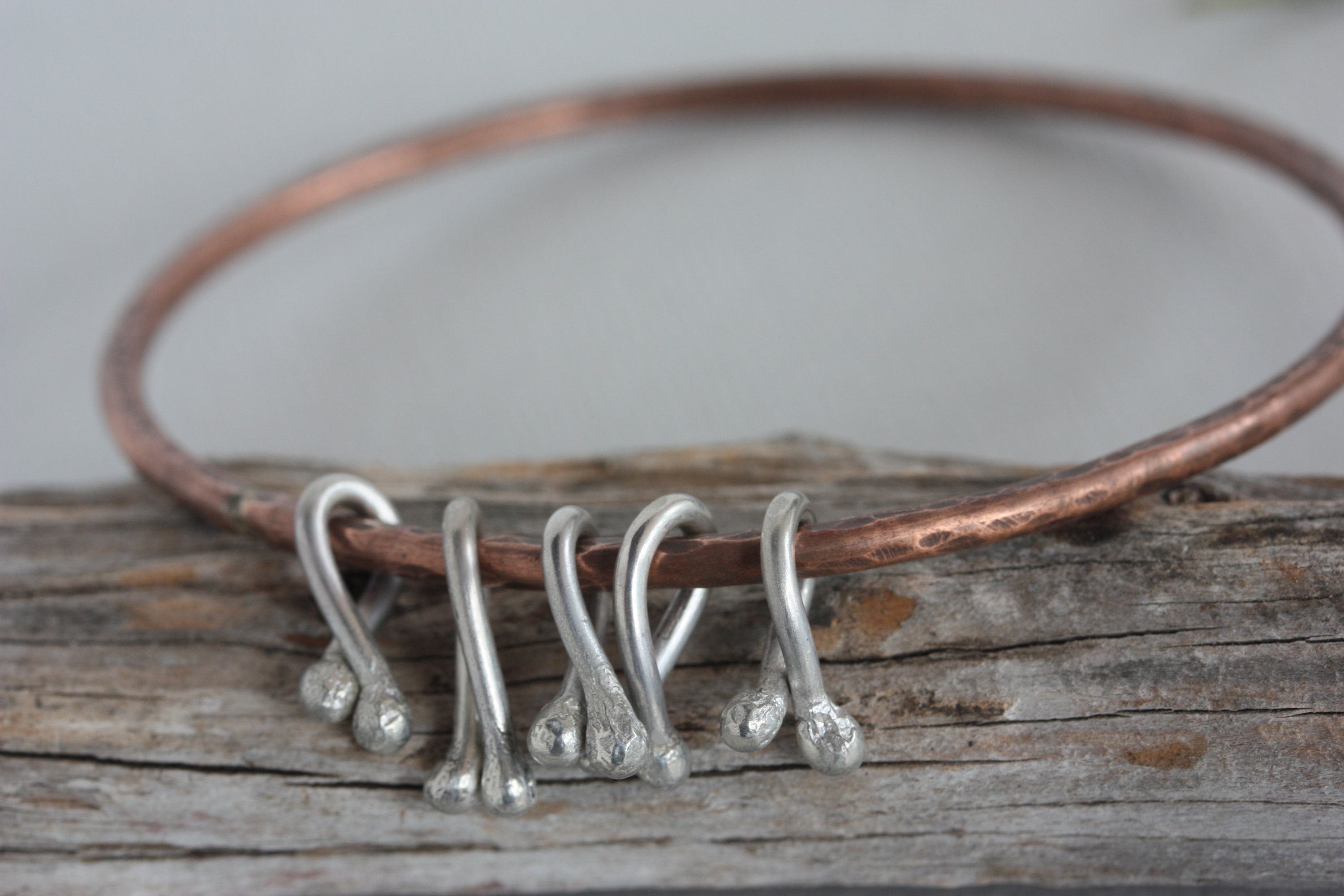 Textured copper bangle bracelet with sterling silver dangle accents.