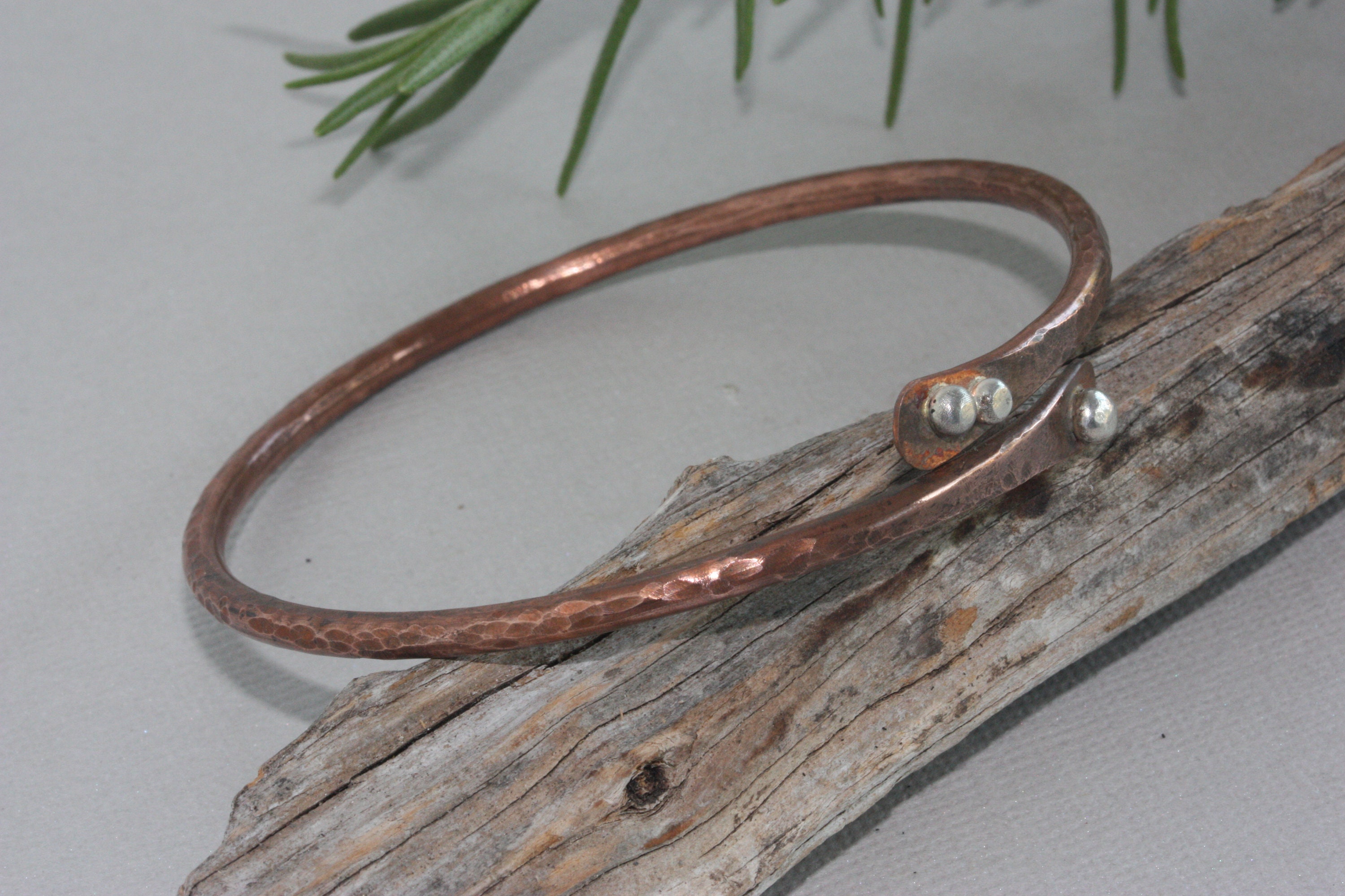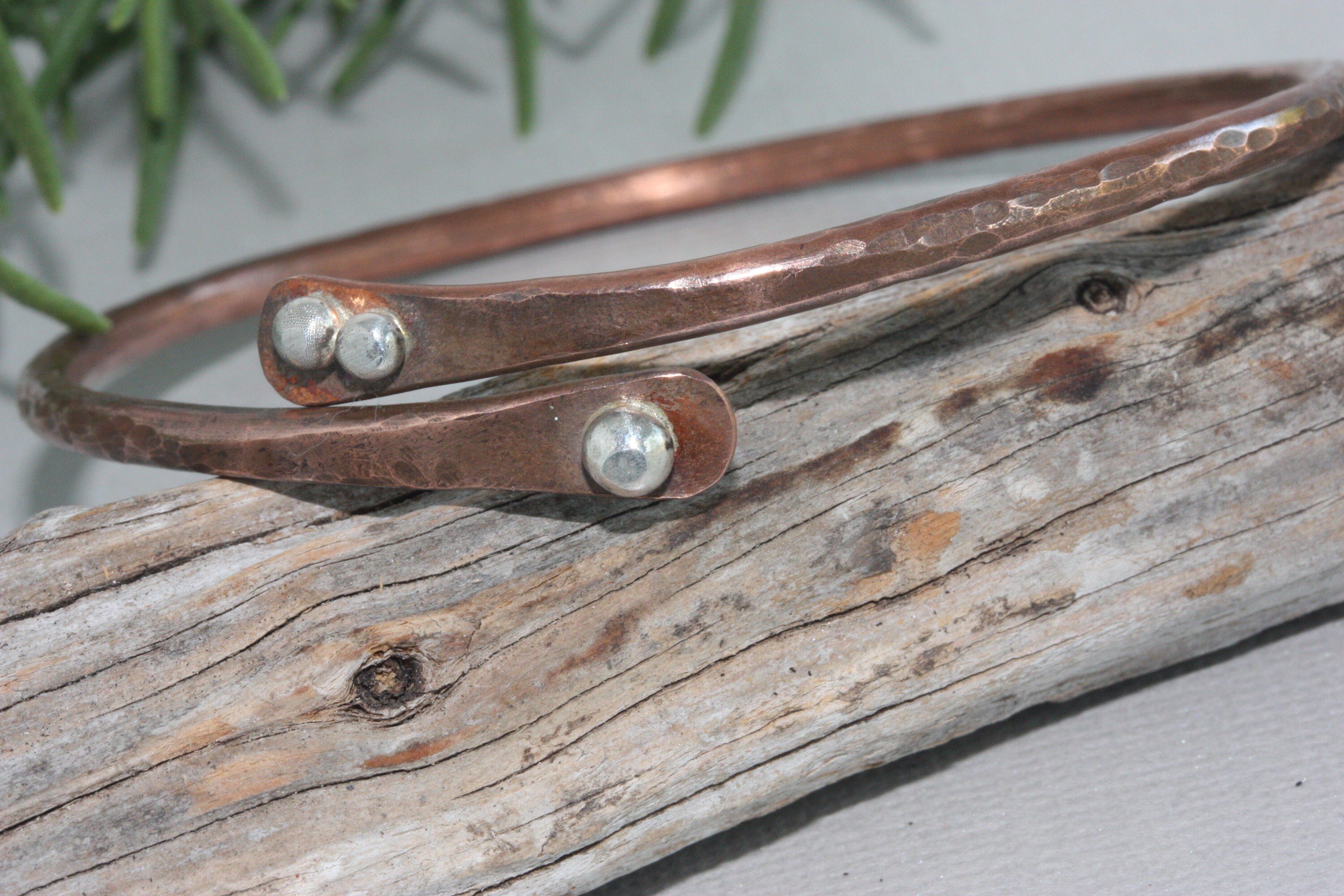 Mixed metal copper bangle bracelet with sterling silver ball accents, handmade.
