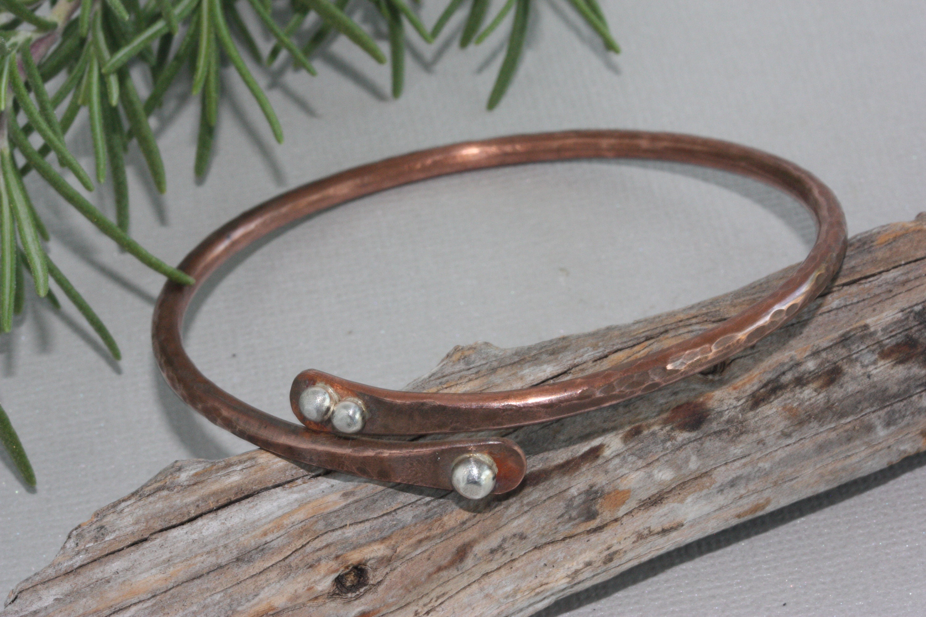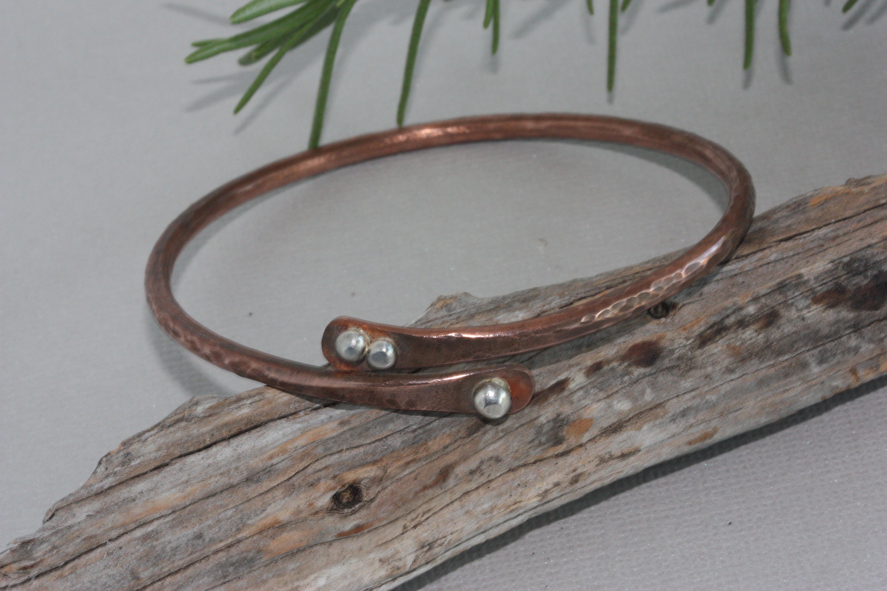 A simple 10 gauge copper wire is hand formed to create a slightly adjustable open wrap bangle bracelet. It is hand textured and then 3 sterling silver ball accents are soldered to the ends to give it a little sparkle! The heat from my torch left a nice red and bronze finish to the copper.